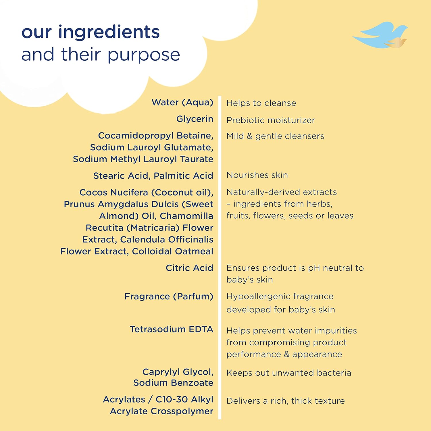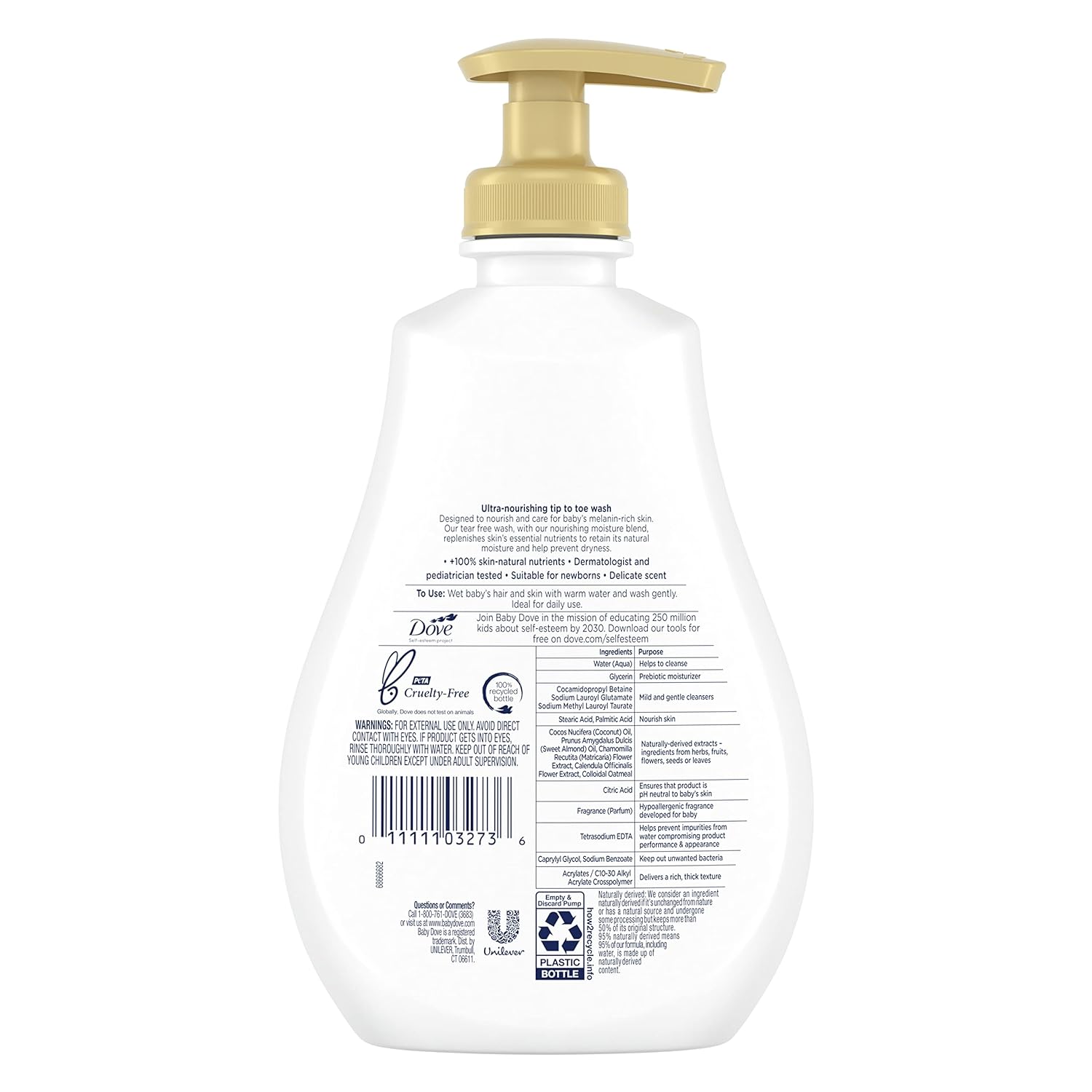Uniquely for your baby, our Melanin-rich Skin Nourishment baby care range is ultra-gentle and ultra-nourishing. Baby Dove Melanin-rich Skin Nourishment Baby Body wash, gently cleanses and replenishes skin's essential nutrients to help prevent dryness. Ultra-gentle and tear free: Our hypoallergenic body wash, is safe for newborn's first bath and made for baby's delicate skin. Created with care and without parabens, dyes, sulfates or phthalates, our baby wash has been tested by pediatricians and dermatologists for baby care that is suitable for everyday use. Ultra-nourishing and non-drying: Our baby bath time wash, made with a nourishing moisture blend, helps to build a foundation for healthy, resilient skin. Baby Dove Melanin-Rich Skin Nourishment Baby Body Wash is non-stripping and helps prevent baby's skin from drying out and flaking. 95% naturally derived baby care formula: Our wash is delicately scented and infused with naturally derived coconut oil, almond oil, calendula, chamomile and oatmeal. Our baby wash and shampoo, is made with 100% skin-natural nutrients, which are nutrients identical to those naturally found in skin, and prebiotic moisture to support baby's natural skin health. To use: Wet baby's hair and skin with warm water during bath time. Gently wash working into a rich creamy lather. Our tip to toe wash can be used as a baby shampoo and body wash. After bathing, finish with Baby Dove Melanin-rich Skin Nourishment Hypoallergenic Cream for all-day moisture. We're here with you. Baby Dove and our baby toiletries support maternal mental health by partnering with Postpartum Support International. We know there's no right or wrong way to be a parent – only your way. That's why Baby Dove is here to help give you confidence that you're providing the best baby care for your baby's skin and hair. Explore our range of baby bath products for baby's melanin-rich skin and textured hair at babydove.com. *We consider an ingredient naturally derived if it's unchanged from nature or has a natural source and undergone some processing but keeps more than 50% of its original structure. 95% naturally derived means 95% of our formula, including water, is made up of naturally derived content.
