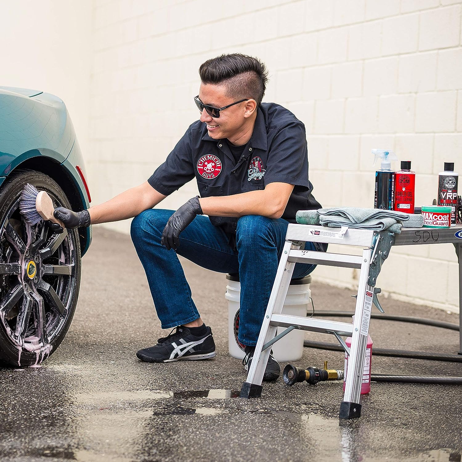 If you hate the look of brake dust and grime on your wheels and rims, then you need the Chemical Guys Best Wheel, Rim, And Tire Kit. Now one convenient package combines the professionals' favorite wheel detailing tools and products for every enthusiast and weekend warrior to enjoy. Whether you're cleaning factory alloys, steel wheels, or custom aftermarket rims, the Best Wheel, Rim, And Tire Kit is the safe and gentle choice for a full wheel detail. Start by breaking down brake dust, dirt, and grime with your choice of Diablo Wheel Gel for light contamination, or Signature Series Wheel Cleaner for heavier debris. The pH-balanced wheel cleaners break down filth and grime, and lubricate the abrasive filth particles for a scratch-free shine. Dilute Diablo Wheel Gel 3:1 in the professional grade Detailing Sprayer Bottle to mist the slick wheel soap wherever it is needed most. Agitate stubborn filth from in-between the spokes with the Show Car Wheel Brush, and gently scrub the face of the hub, spokes, rim, and tire with the Flagged-Tip Body & Wheel Brush. Use the Workhorse Applicator Pad to spread a coat of Max Coat Wheel Guard over shiny wheel surfaces to repel future brake dust and road grime, enhance a high gloss shine, and make them easier to clean down the road. Spread the perfect coat of VRP Tire Shine with the Wonder Wave Durafoam Applicator Pad, and finish off the full wheel detail with the rich black look of shiny new tires. The Best Wheel, Rim, And Tire Kit is the single best choice for any enthusiast or professional who needs a deep wheel cleaning detail.