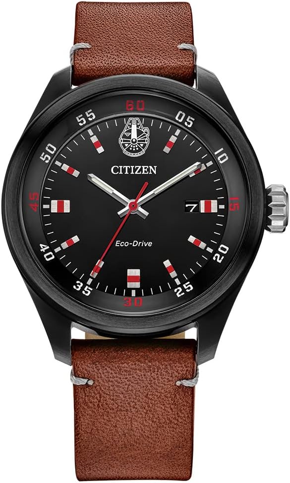 Citizen Eco-Drive Men's Star Wars Chewbacca Black IP Stainless Steel on Brown Leather Strap, 3-Hand Date, Luminous, 43mm (Model: AW5008-06W)