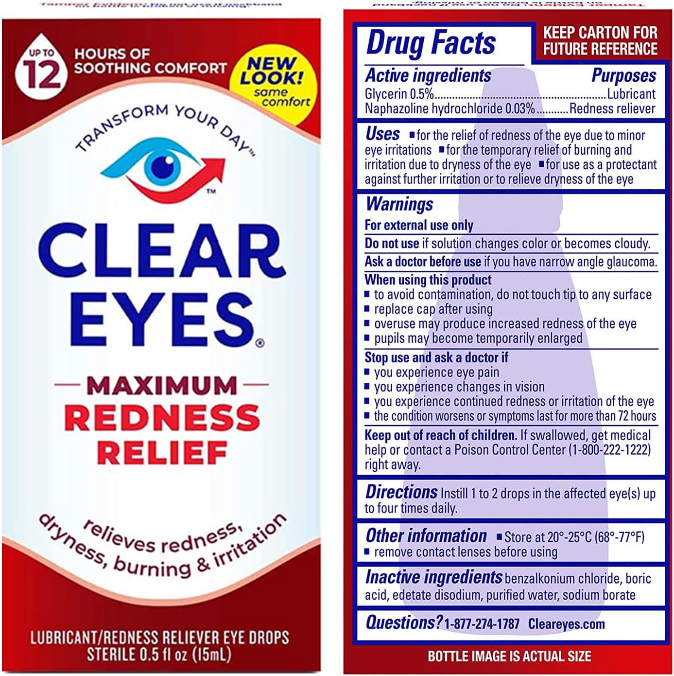 • Contains 3 bottles of Clear Eyes Maximum Strength Redness Relief Eye Drops, 0.5 fl oz