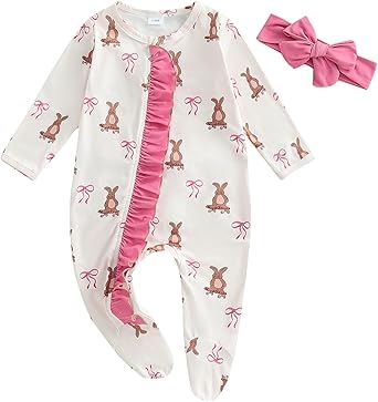 Easter Baby Girl Outfit Ruffle Bunny Print Footies Romper Jumpsuit Newborn Infant Baby Girl Easter Bunny Clothes