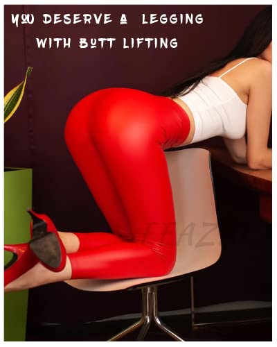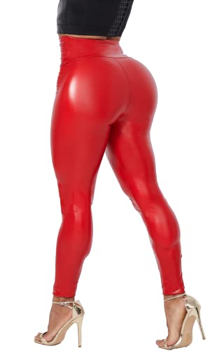 Feazac Women High Waist Comfy Faux Leather Leggings Tights Stretchy Pleather Pants Sexy Stretchy Pants Butt Lifting Push Up PU Tights *Classic - Matte Red, Large