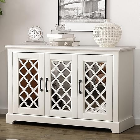 Galano Millicent 3 Door Sideboard with Acrylic Mirrors, Kitchen Buffet Cabinet, Farmhouse Coffee Bar Display Cabinet for Home Kitchen, Living Room, Dining Room and Hallway, Ivory