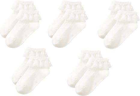 Gwenveni Toddler Girls Ruffle Lace Trim Cotton Socks Eyelet Frilly Dress Socks 5 -Pack