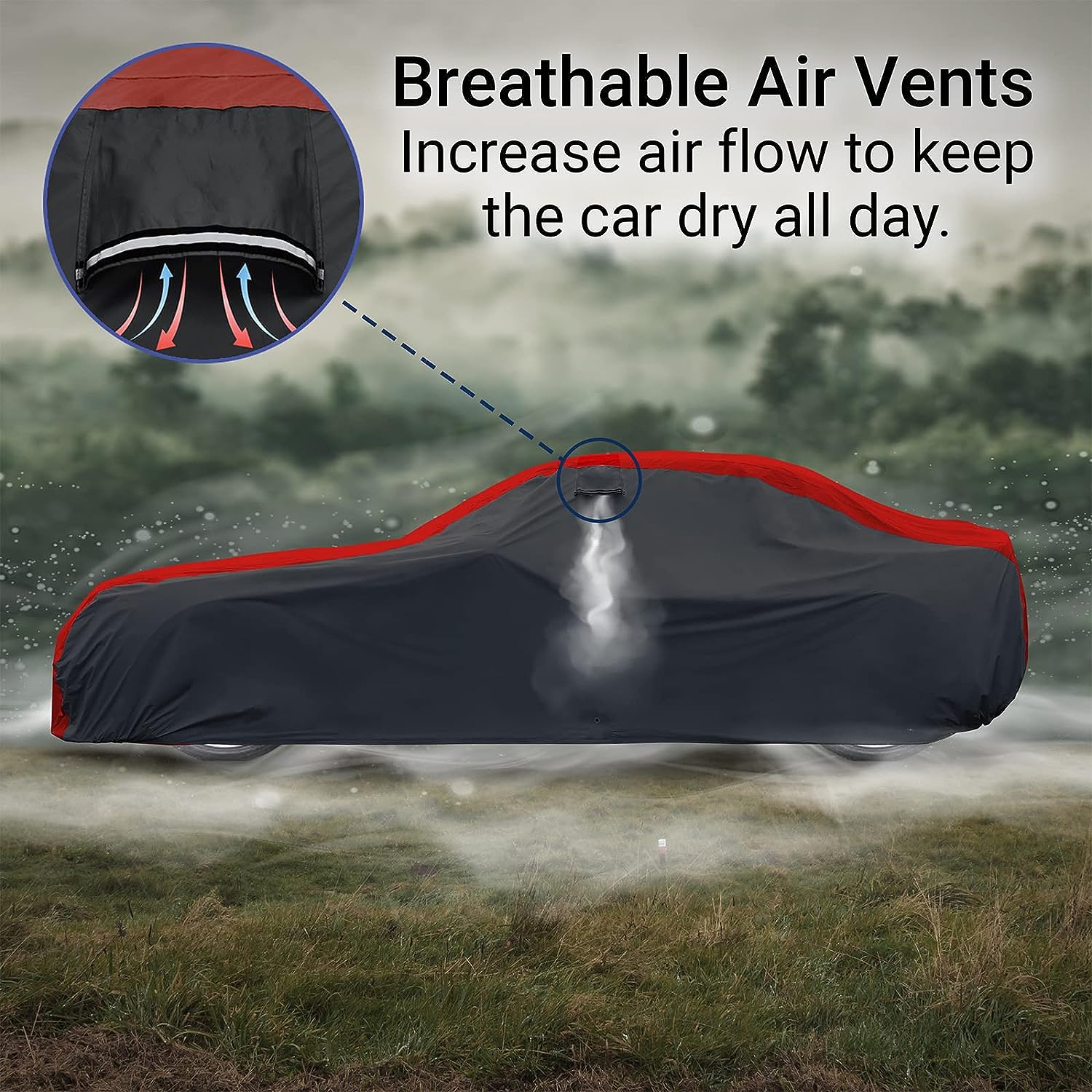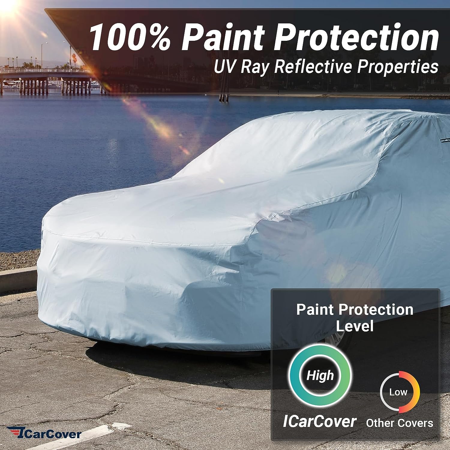• Advanced Features: Waterproof lined seams prevent leakage and air ventilation prevents humidity and water. iCarCover all weather car covers can handle it all. Our thick high grade GSM matierials are machine cut, multlayered and bond-pressed for optimal protection.
