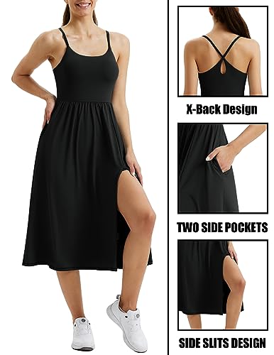 JACK SMITH Black Athletic Dress Womens Golf Dresses Built in Bra and Shorts Side Slit Workout Midi Dress with Pockets S