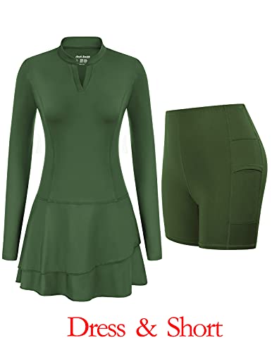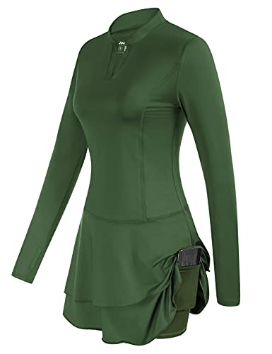 Details: Jack Smith Women Athletic Dresses with Shorts Long Sleeve Golf Tennis Dress Pockets with Thumb Holes A LIGHTWEIGHT GOLF DRESS THAT COMBINES COMFORT AND STYLE -- Inspired by the elegance of sport, our Performance V-Neck Tennis Dress is a play on iconic sportswear. Made from performance flatlock stitching with a silky-soft feel, it is breathable and moisture wicking and has great stretch and recovery. On the court, pair with our Seamless Shorts. -- This sports dress featuring modern stand collar – a best seller year after year. -- UPF50 fabric blocks harmful UV rays, provides excellent protection against sunburn. Recommended for traveling, hiking, Golf, Tennis, relaxing by the oceanside, everyday wear or other outdoor activities -- Thumbholes keep sleeves in place and give more coverage to block uv rays when you're hiking or camping -- Warm tips: Machine washable (cold water) and hang dry. Feature: Dress hits at mid-thigh Long sleeves with thumb hole Stand collar V-Neck Dual layer skirt Flat-lock stitching Separated mesh shorts with side pocket Both dress and shorts are well elastic Two piece set sports wear, including a dress and a shorts These Women Athletic Dresses are perfect for tennis, running and golf, and of course, a trip to your after-court party with your friends. It was designed for confident women like you!