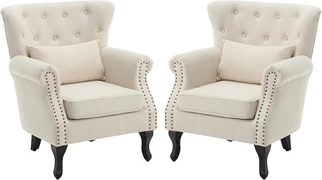 KCC Living Room Accent Chair Mid Century Modern Reading Arm Chair for Bedroom Set of 2, Upholstered Club Chair Single Sofa Chair with Tufted Back, Rubber Wood Legs and Lumbar Pillow, Beige