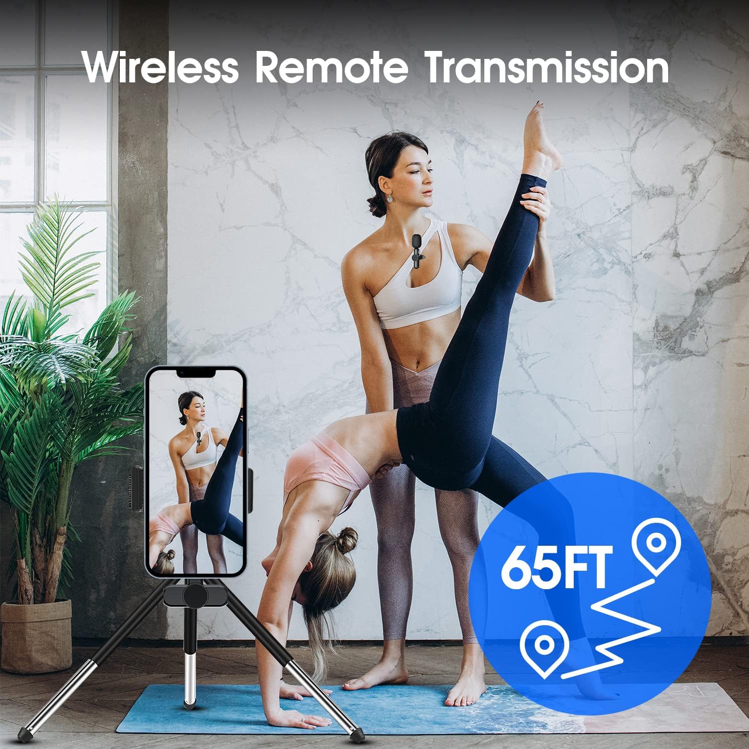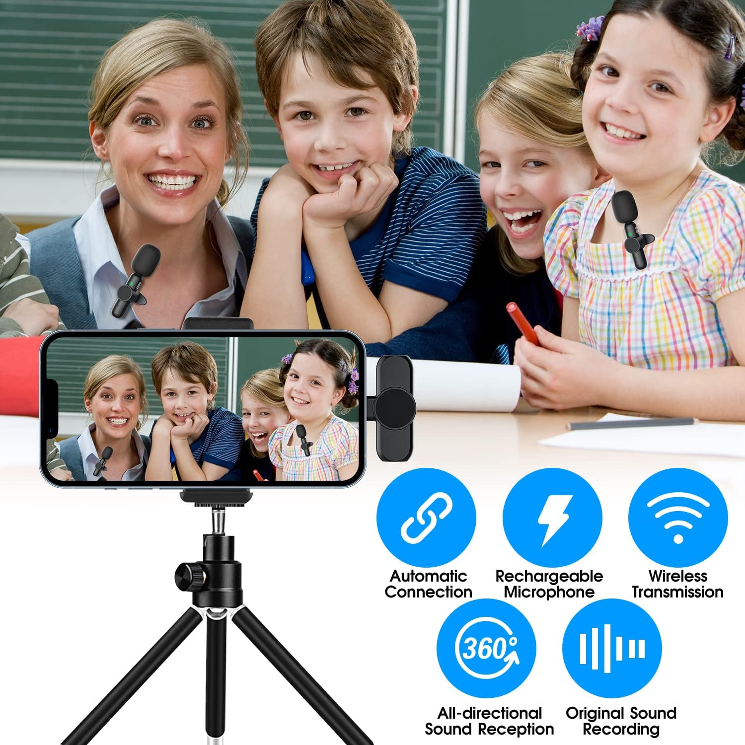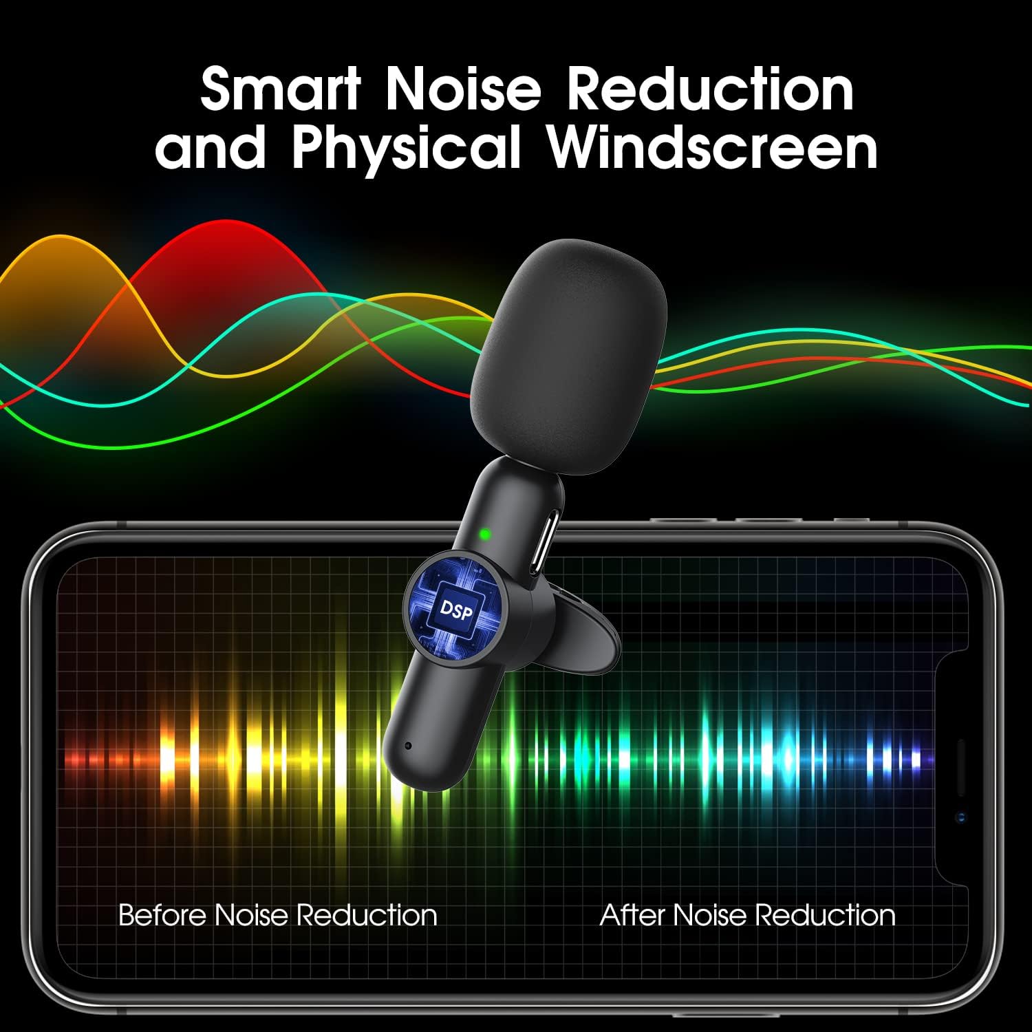 • 【8H Working Time & Sharp Audio at Distance】Wireless microphones Built-in 100mAh rechargeable battery works up to 8 hours on a single 1-hour charge. A powerful wireless 65ft transmission keeps audio stable, even at long distances. With a USB Type-C/Lightning interface on each unit, we can charge iPhone while recording. No more low battery panic.