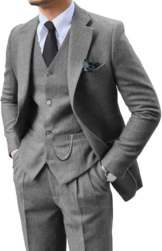 Mens Suit 3 Pieces Slim Fit Tweed Herringbone Retro Wool Suits Groom Tuxedos Prom Wedding Suits Jacket Blazer Vest Pants Sets