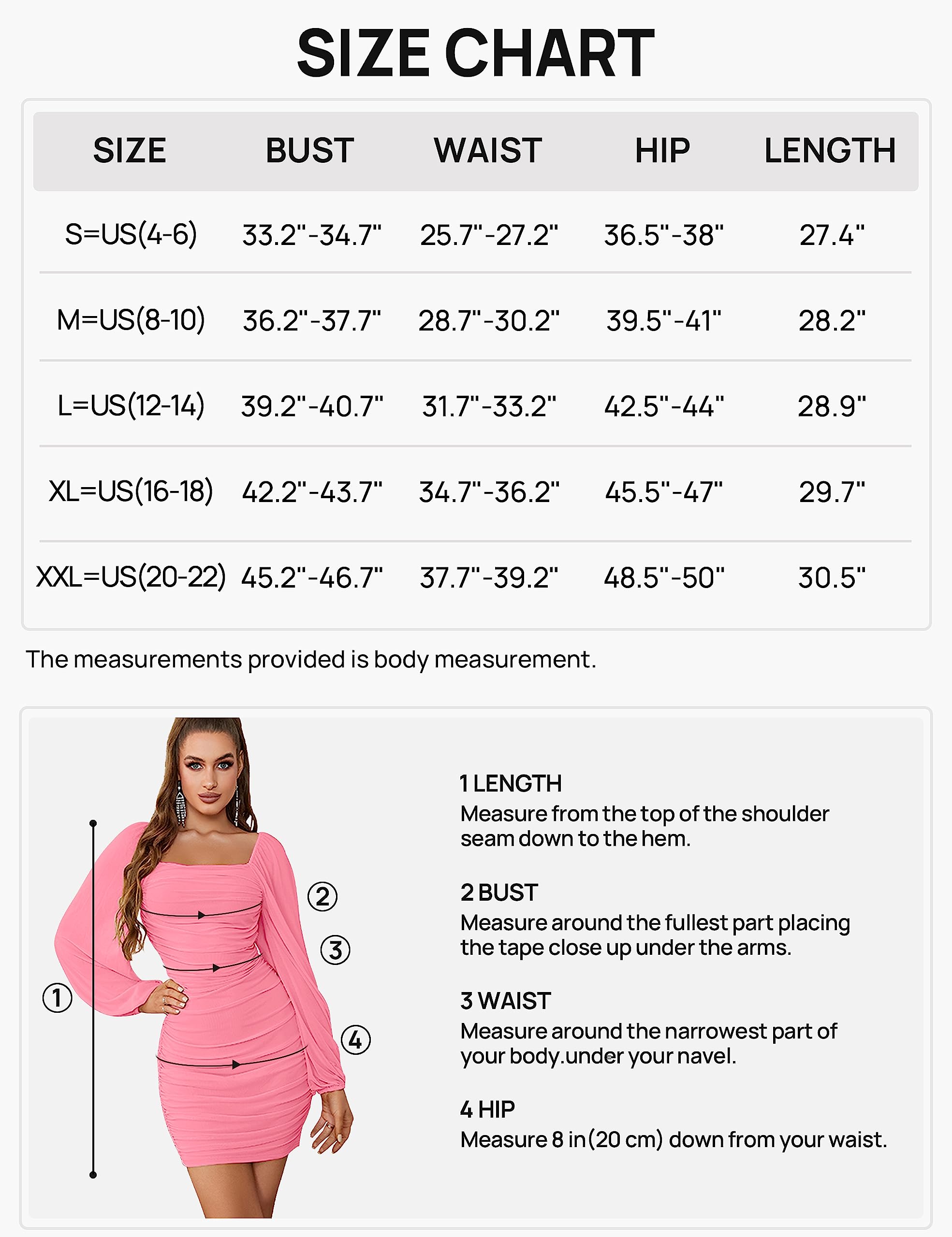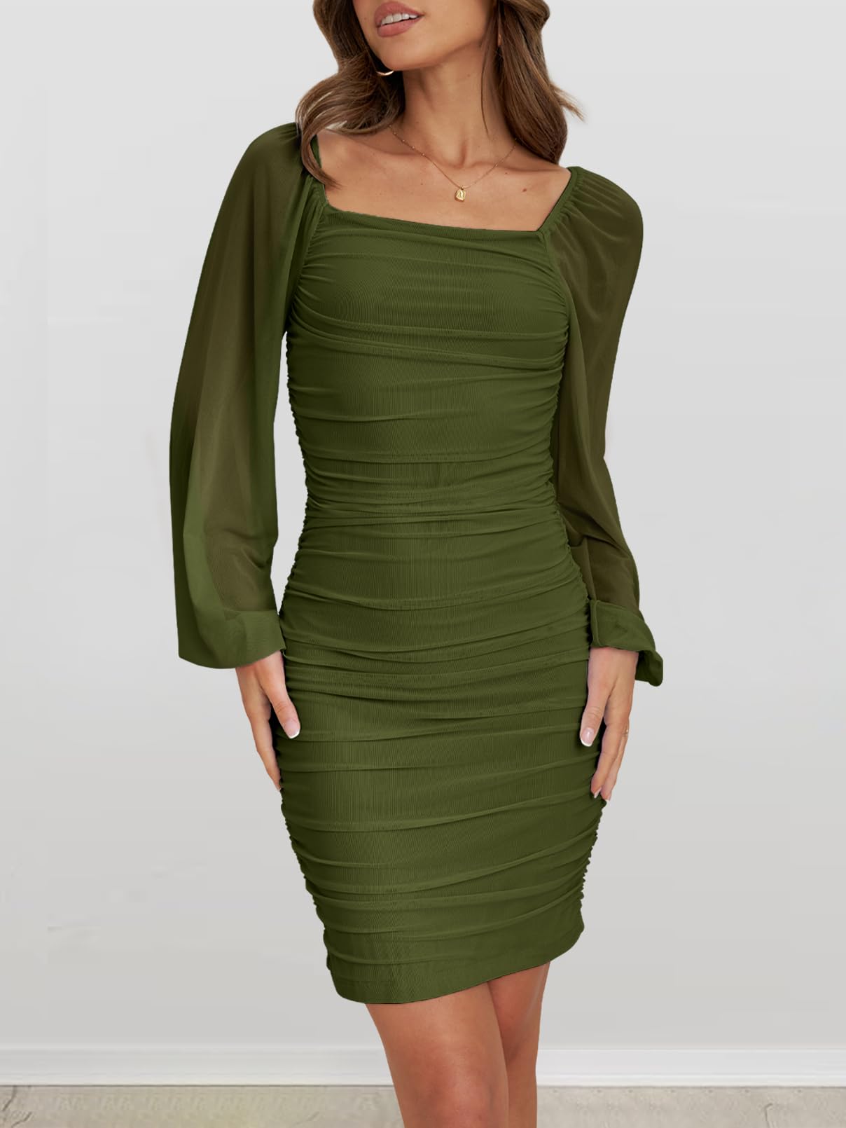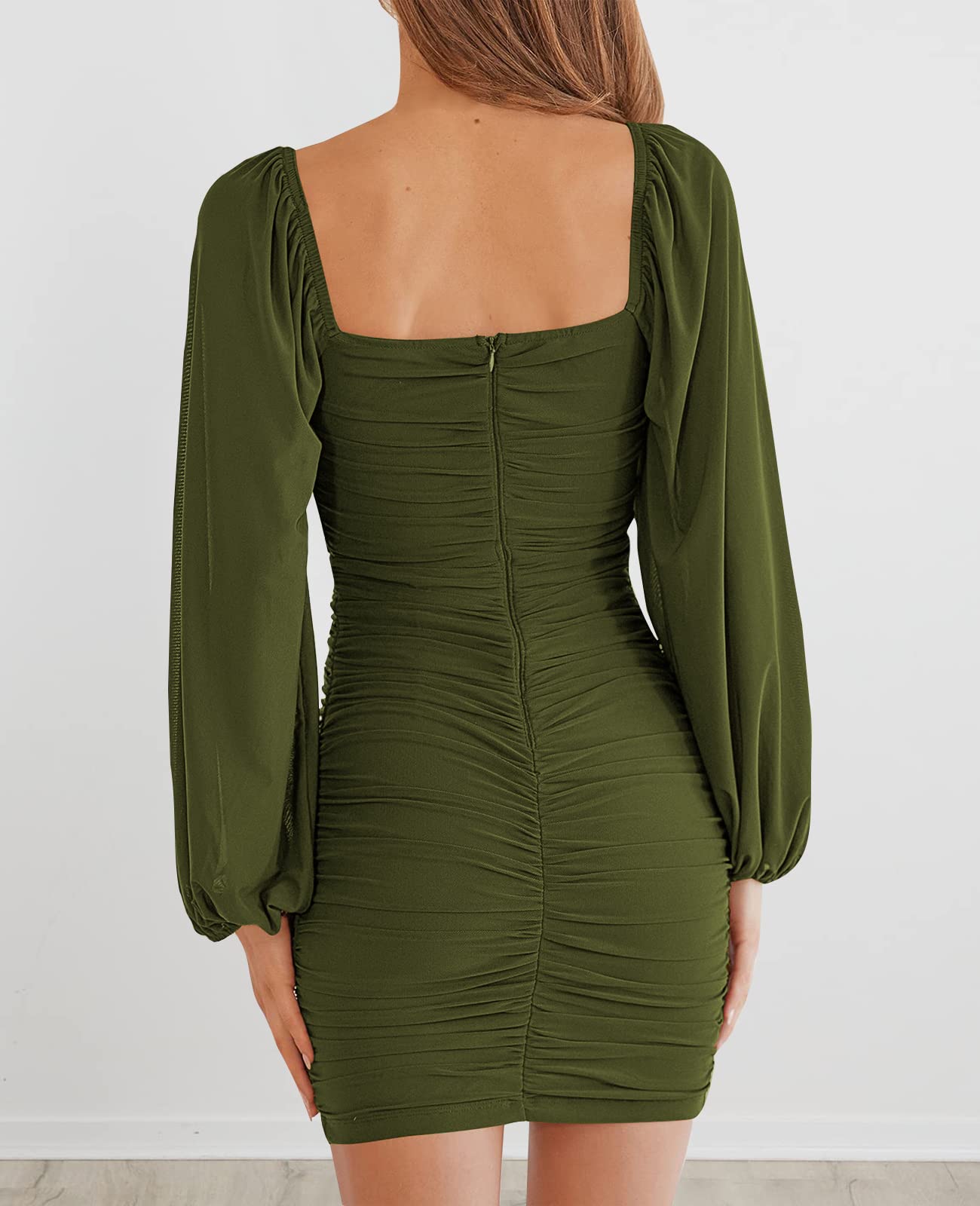 Details: MEROKEETY Women Square Neck Lantern Long Sleeve Mesh Ruched Bodycon Clubwear Mini Dress