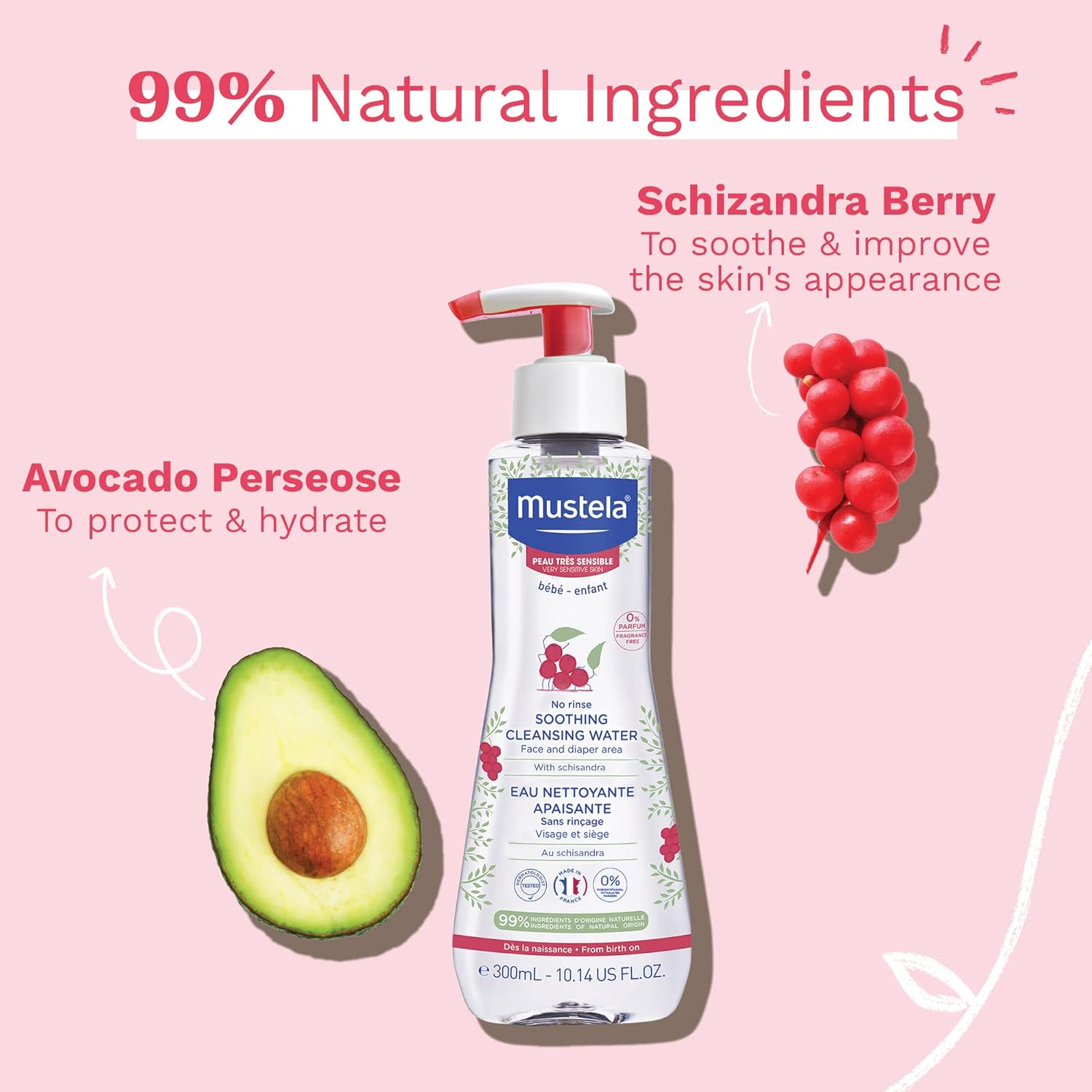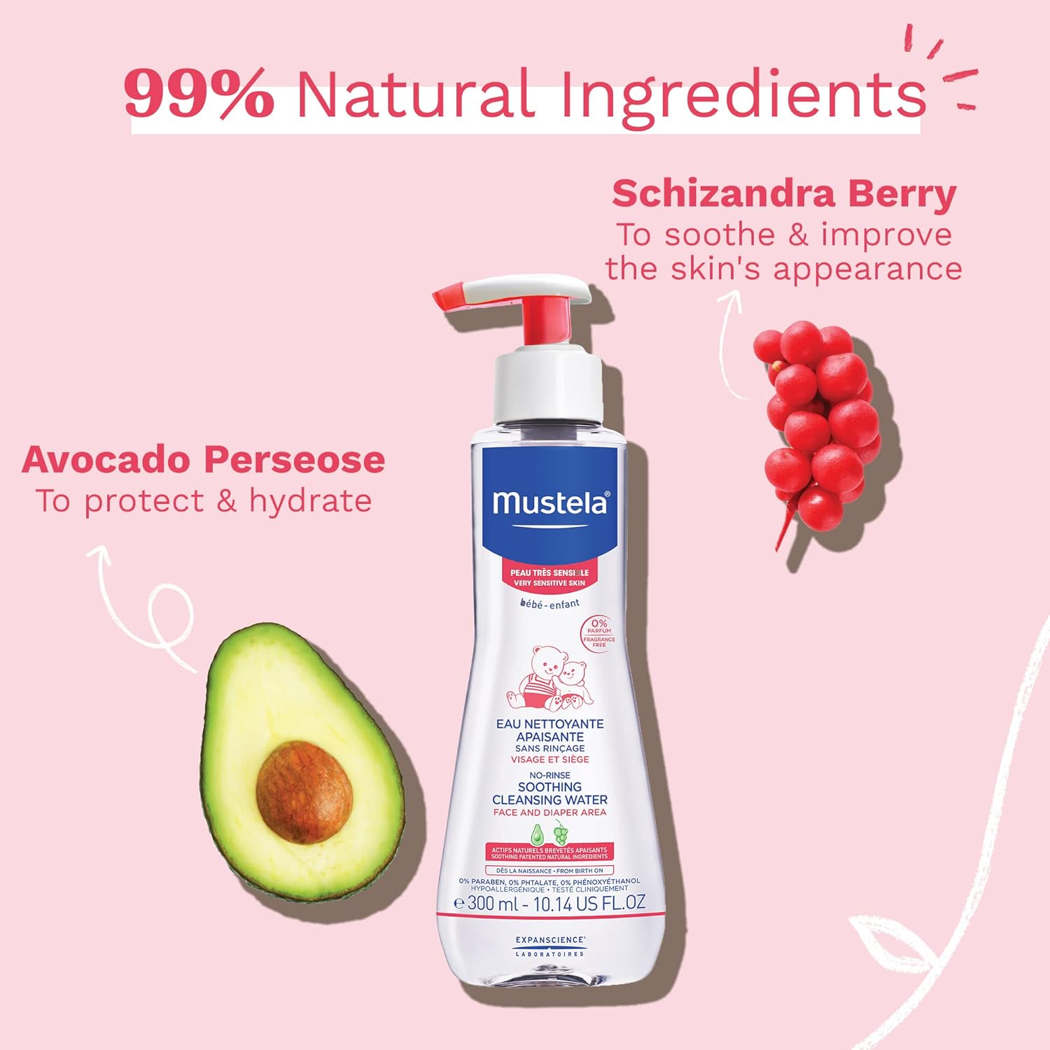 Mustela Baby Soothing Cleansing Water - No-Rinse Micellar Water for Very Sensitive Skin - with Natural Avocado & Schizandra Berry - Fragrance Free & EWG Verified - 10.14 fl. oz.