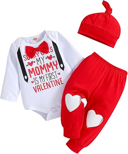 My First Valentine's Day Outfits for Infant Baby Boy Long Sleeve Romper Bodysuit Heart Letter Trousers Hat Set
