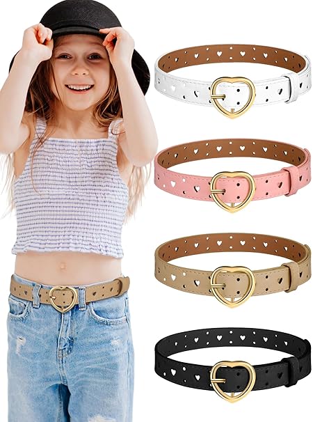 Newcotte 4 Pcs Girls Belt Size Aged 3-12 Kids PU Leather Waist Belt Hollow Heart Design Kids Belts for Dress Pants Jean