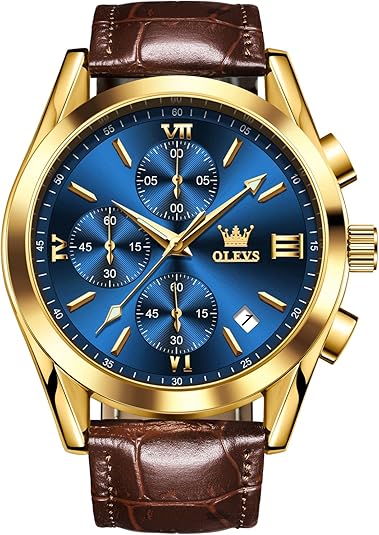 OLEVS Watch for Men Chronograph Brown Leather Gold Case Analog Quartz Fashion Business Dress Large Face Men Watch Day Date Luminous Waterproof Casual Male Wrist Watch Black/Blue/White Dial
