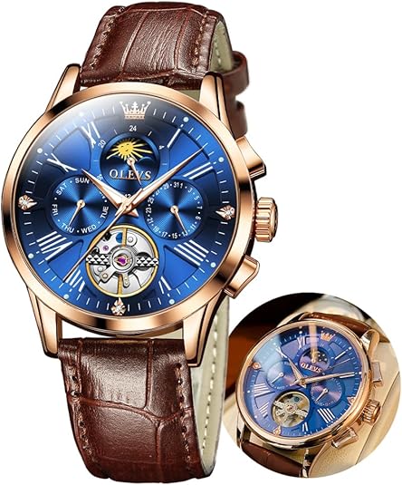 OLEVS Watches for Men Automatic Tourbillon Moon Phase Luxury Business Dress Brown Leather Strap Blue Face Mechanical Self Winding Waterproof Luminous Watches