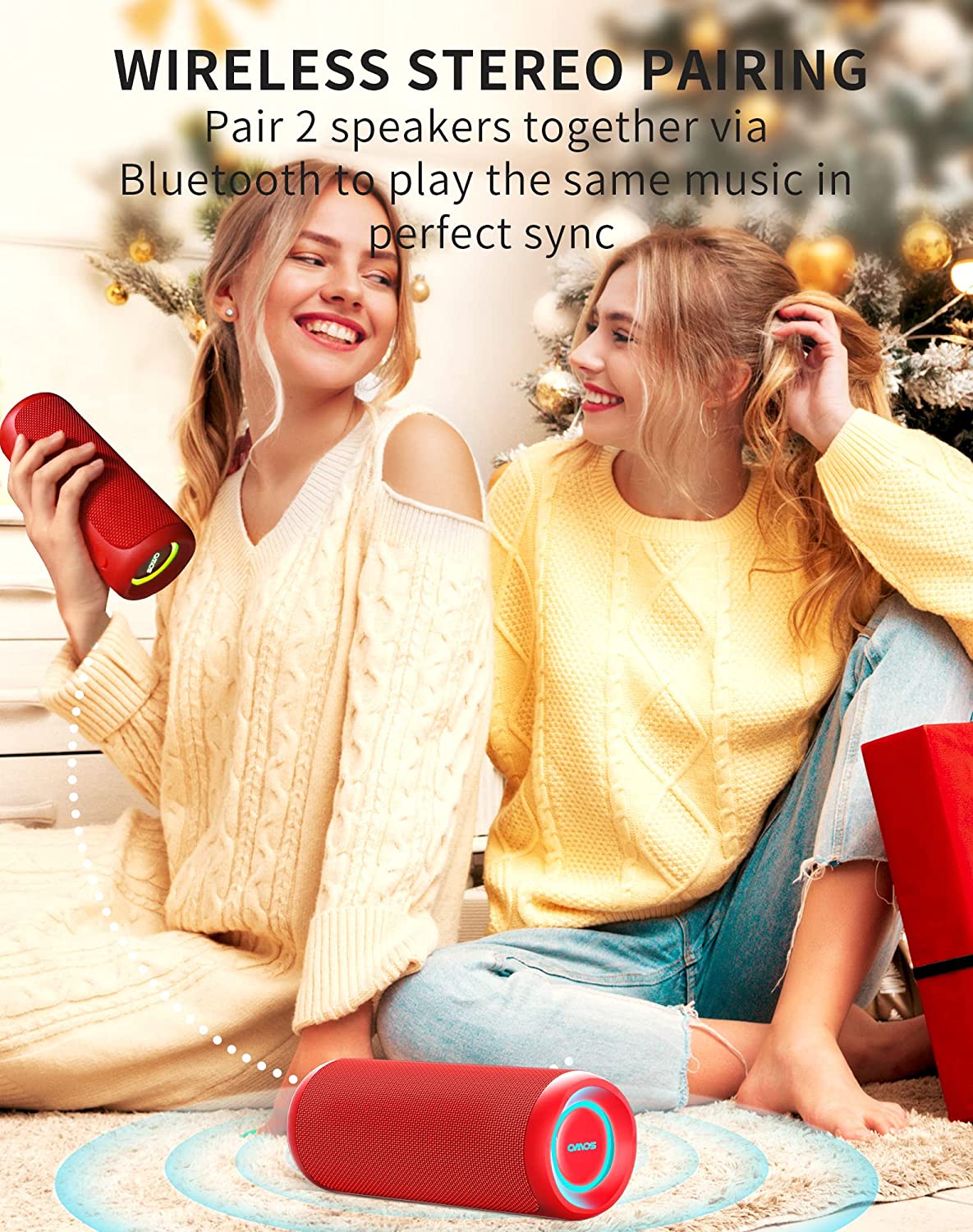 Portable Speaker, Wireless Bluetooth Speaker, IPX7 Waterproof, 25W Loud Stereo Sound, Bassboom Technology, TWS Pairing, Built-in Mic, 16H Playtime with Lights for Home Outdoor - Red