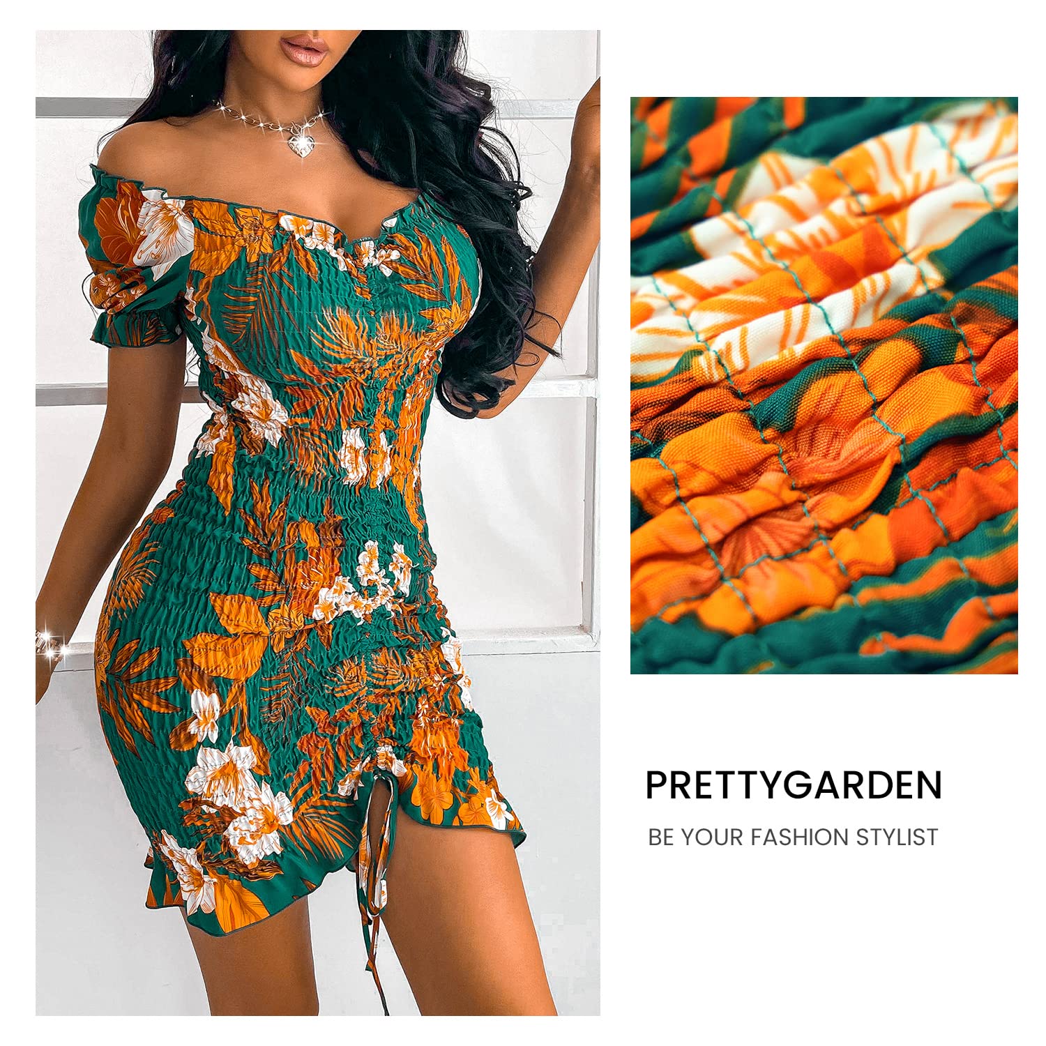 PRETTYGARDEN Women's Summer Off Shoulder Bodycon Dresses Short Sleeve Drawstring Sexy Mini Party Club Smocked Dress (Dark Green,X-Large)