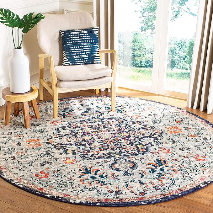 SAFAVIEH Madison Collection 3' Round Beige / Black MAD447B Boho Chic Medallion Distressed Non-Shedding Dining Room Entryway Foyer Living Room Bedroom Area Rug