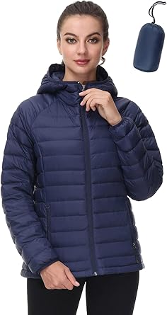 SLOW DOWN Women Lightweight Down Puffer Jacket, Women Hooded Packable Winter Jacket with 2 Packing Bag