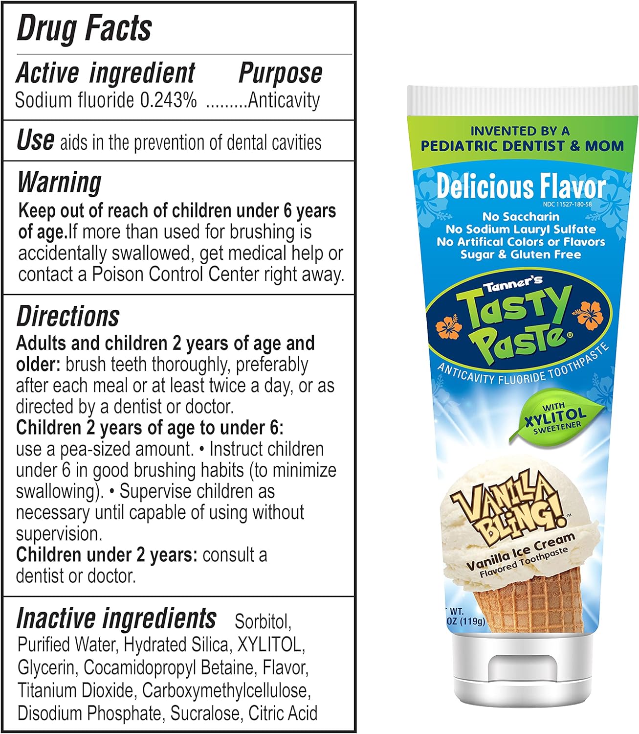 Tanner's Tasty Paste Vanilla Bling - Anticavity Fluoride Children’s Toothpaste/Great Tasting, Safe, and Effective Vanilla Flavored Toothpaste for Kids (4.2 oz.)