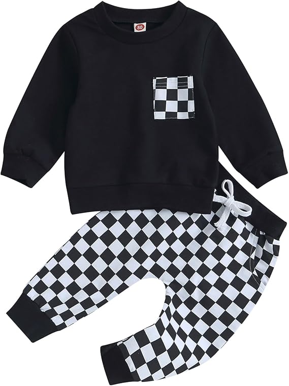 Toddler Baby Boy Fall Winter Clothes Checkerboard Long Sleeve Sweatshirt Pants Sweatsuit Set Checkered Plaid Outfit