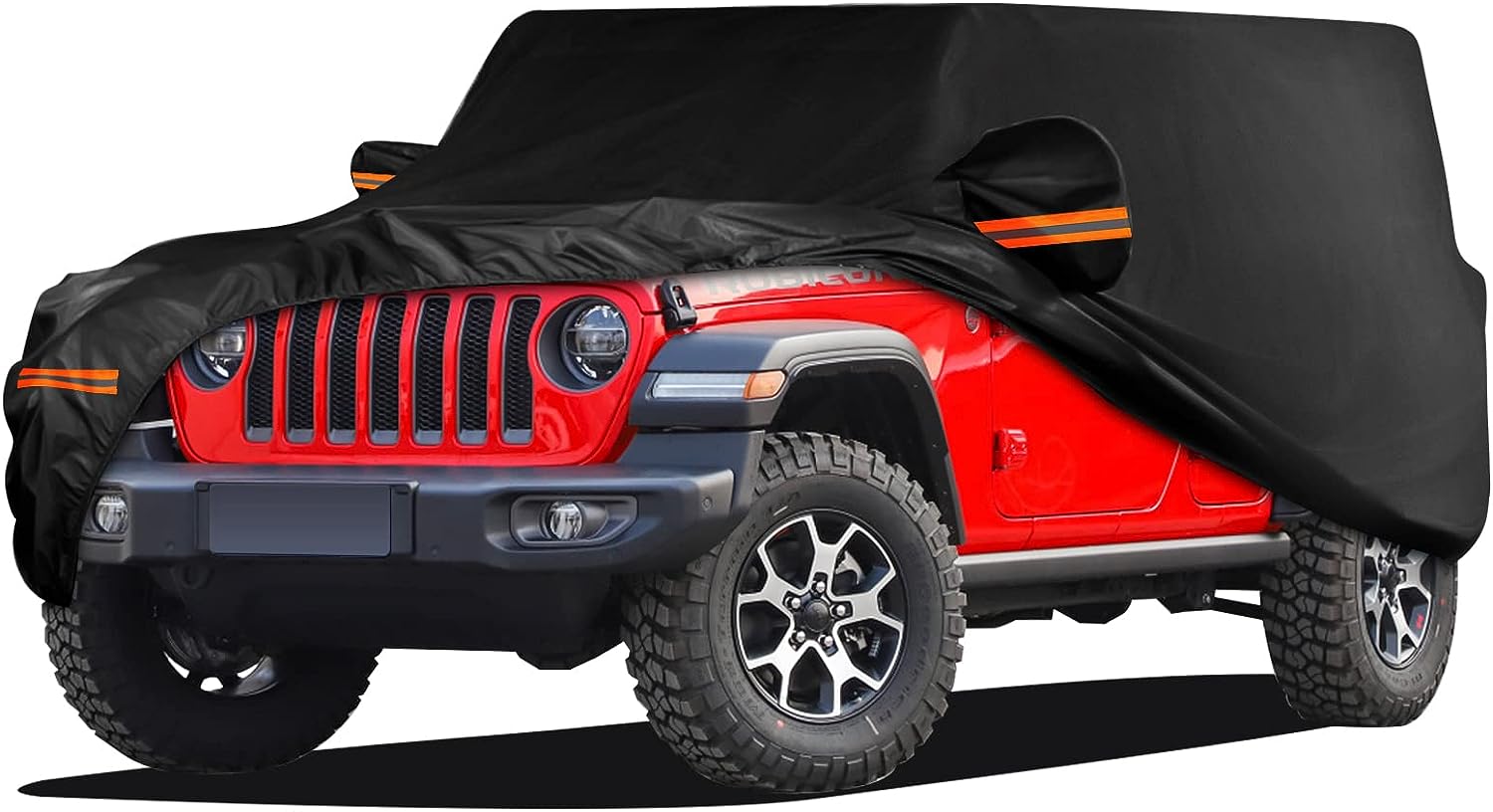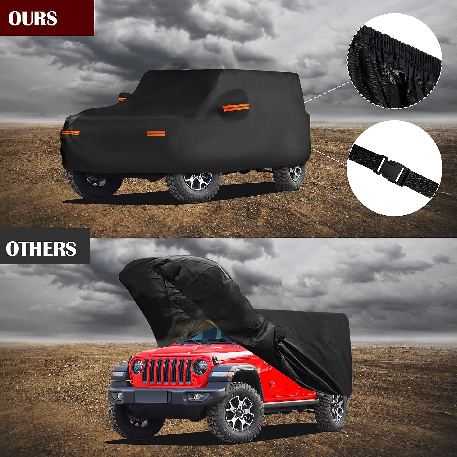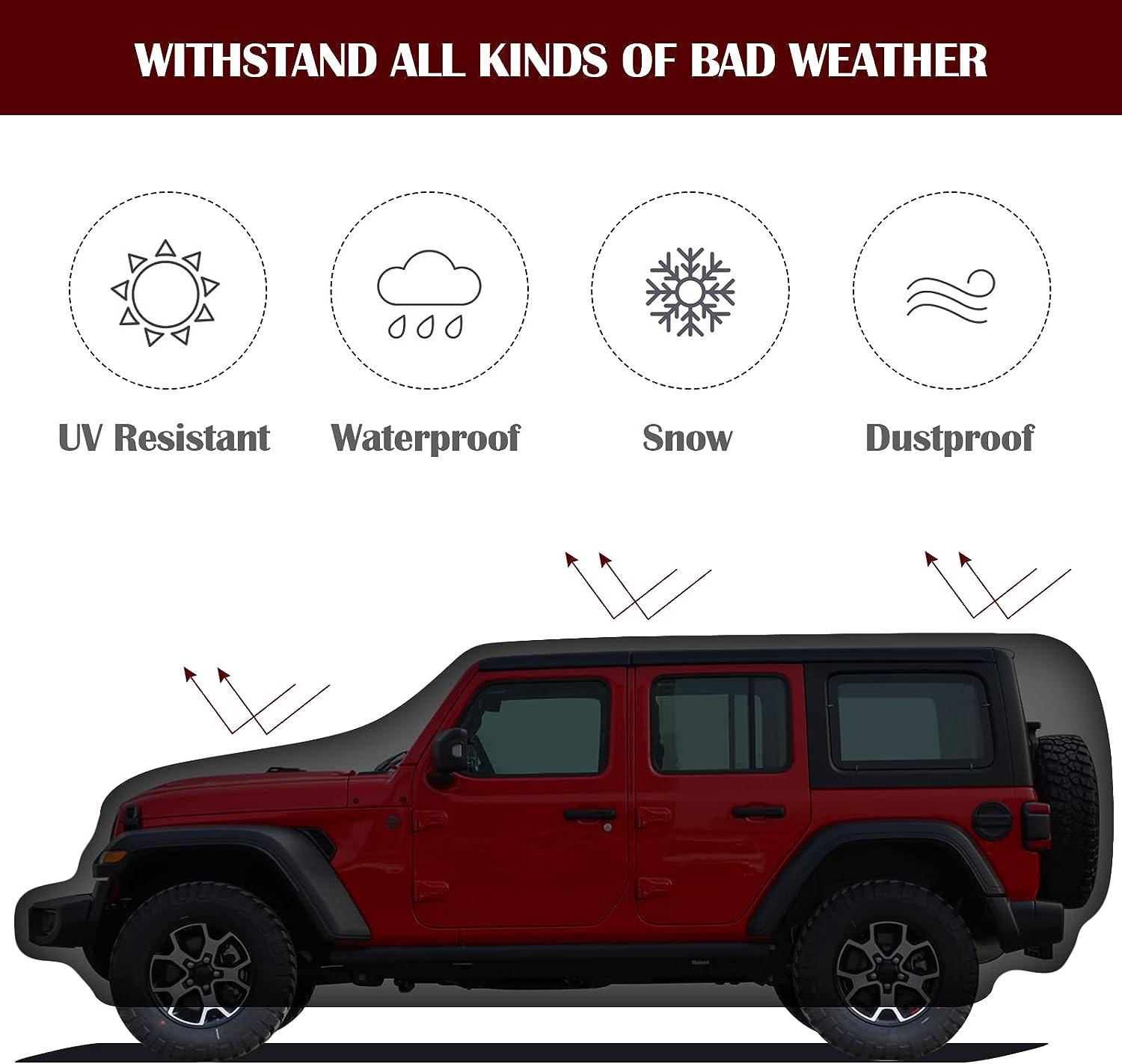 • APPLICABLE MODELS - Cover size 490x190x150cm / 193"x74.8"x59"(L*W*H). SUV car cover for Jeep Wrangler 4 door JK JL, 2007-2023.