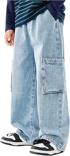 Verdusa Boy's Cargo Jeans Elastic Waist Wide Leg Long Denim Trousers with Pocket