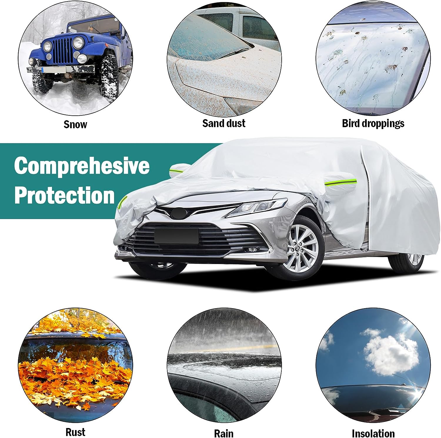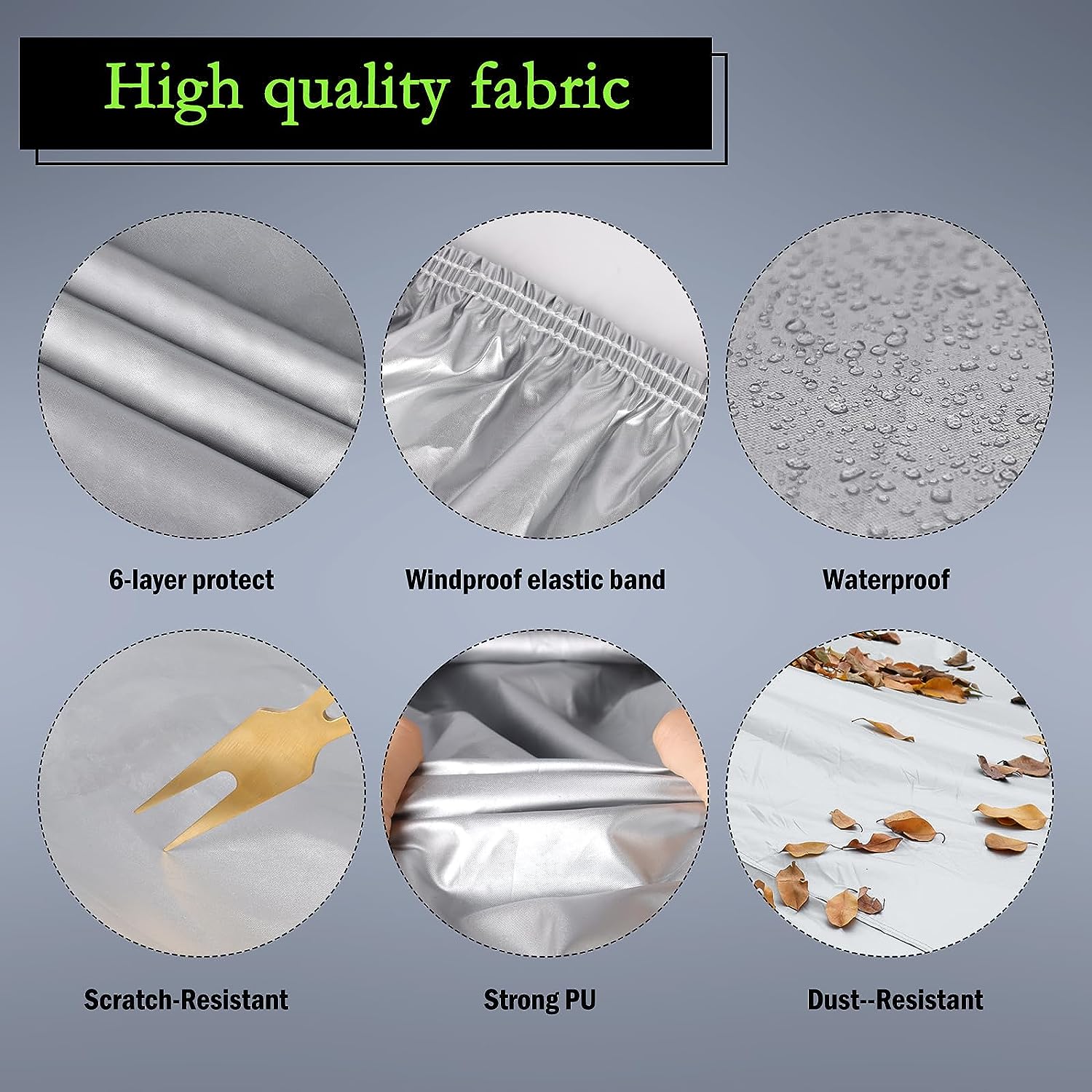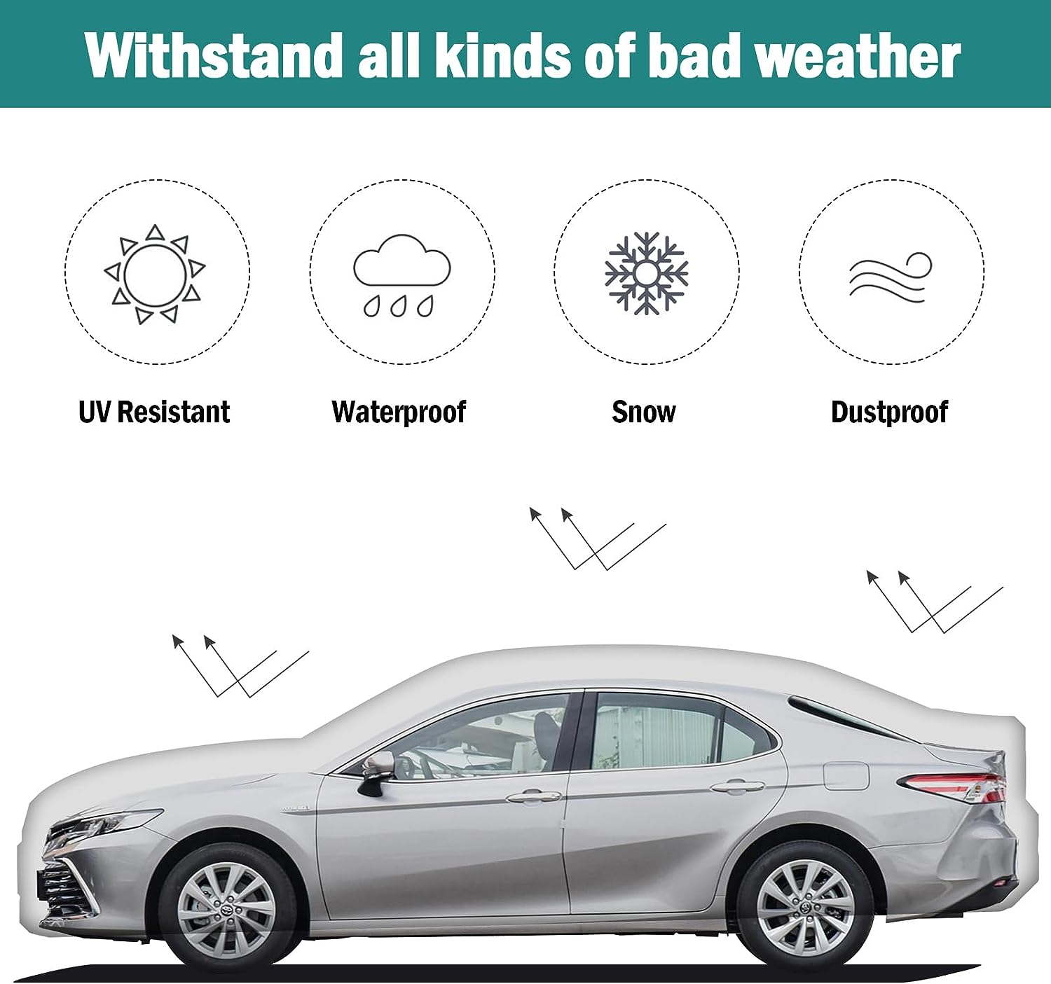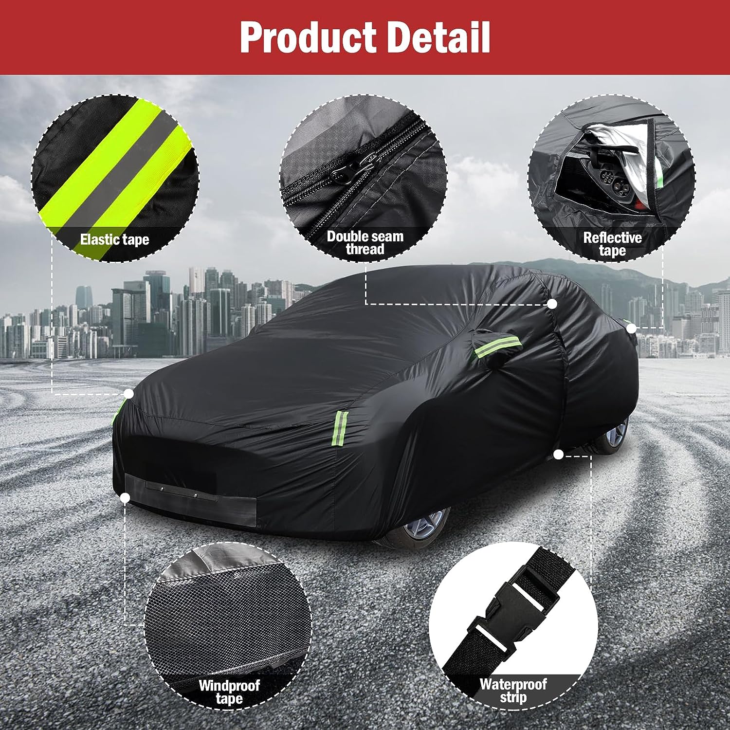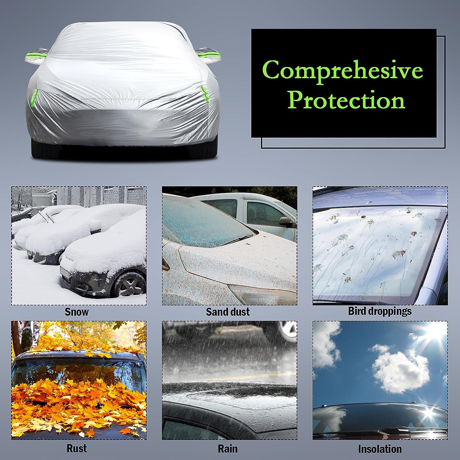 • ALL WEATHER PROTECTION - Update material with waterproof cloth double stitched and reinforced seams,provides overall protection of vehicle from all weather elements: , hail snow, dust, rain and other harmful material.Good for snowproof in winter and keeps cool in summer