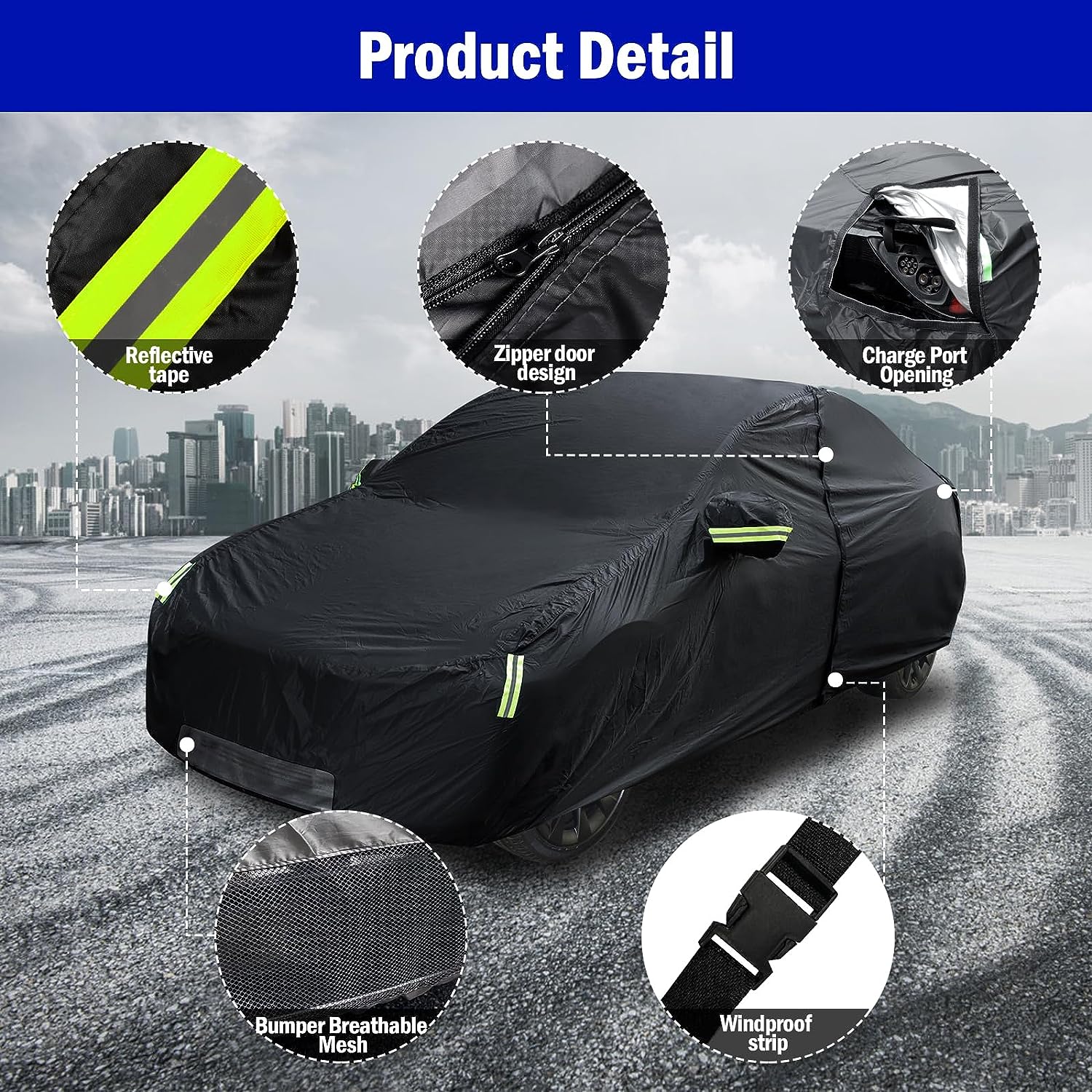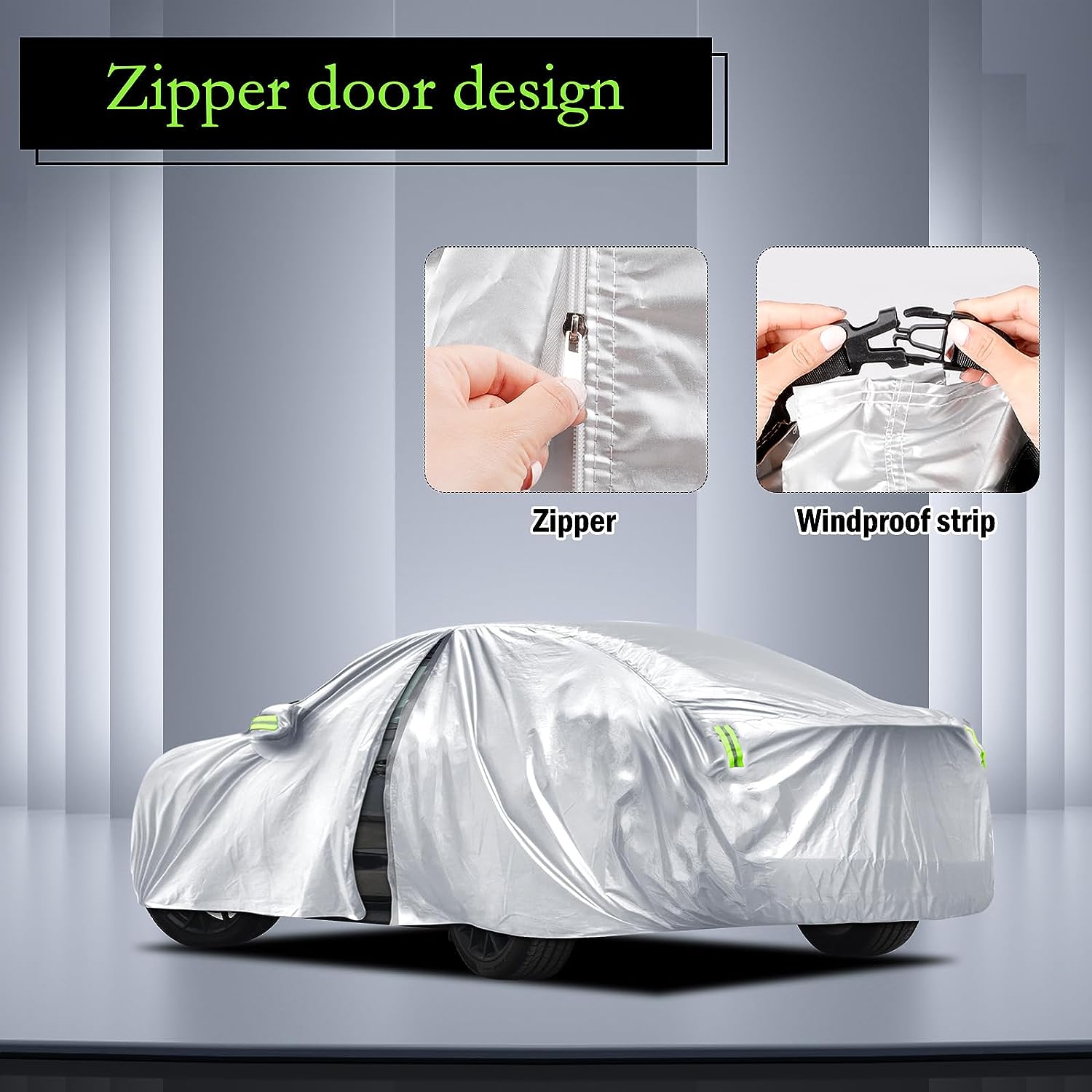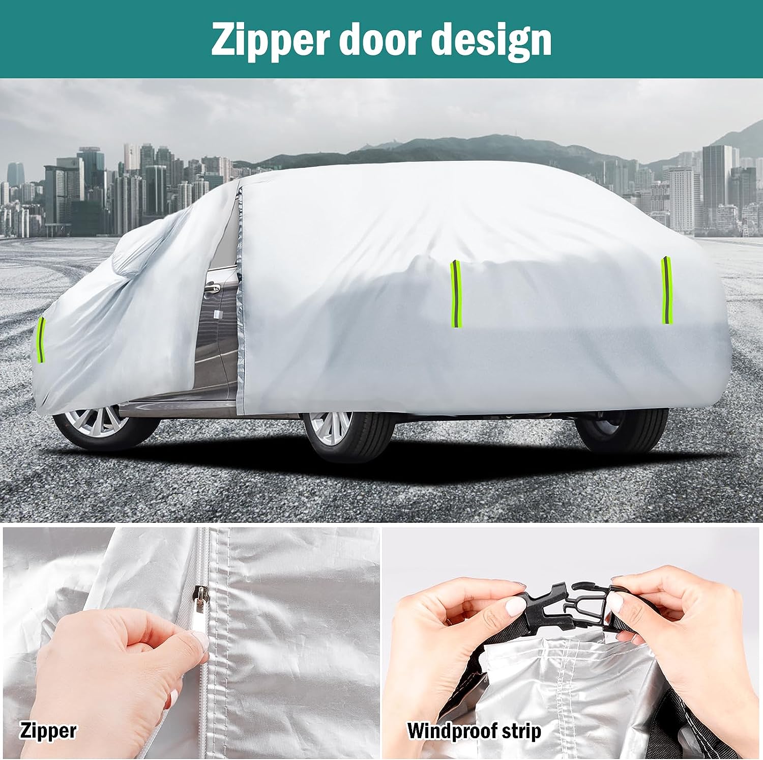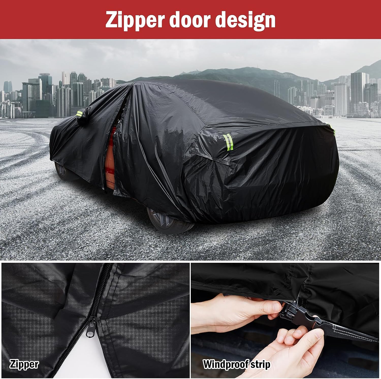 • ALL WEASAFETY DESIGN - Reflective warning bar:Designed with fluorescent orange color emit light at night to avoid unexpected impact. Driver Door Zipper: For easy access anytime. Windproof Straps and Elasticized Hem: windproof design to fix on the car against strong winds.