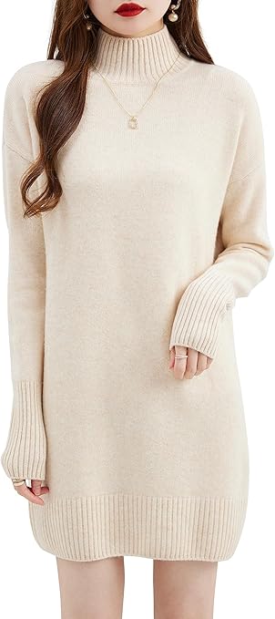 Women Pullovers 100% Merino Wool Long Sweater Dress Warm Long Sleeve Knit Jumper Turtleneck Sweater