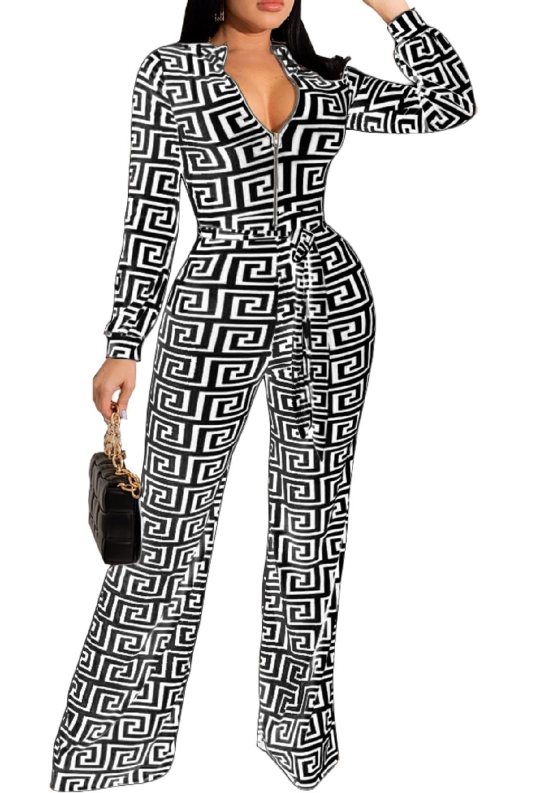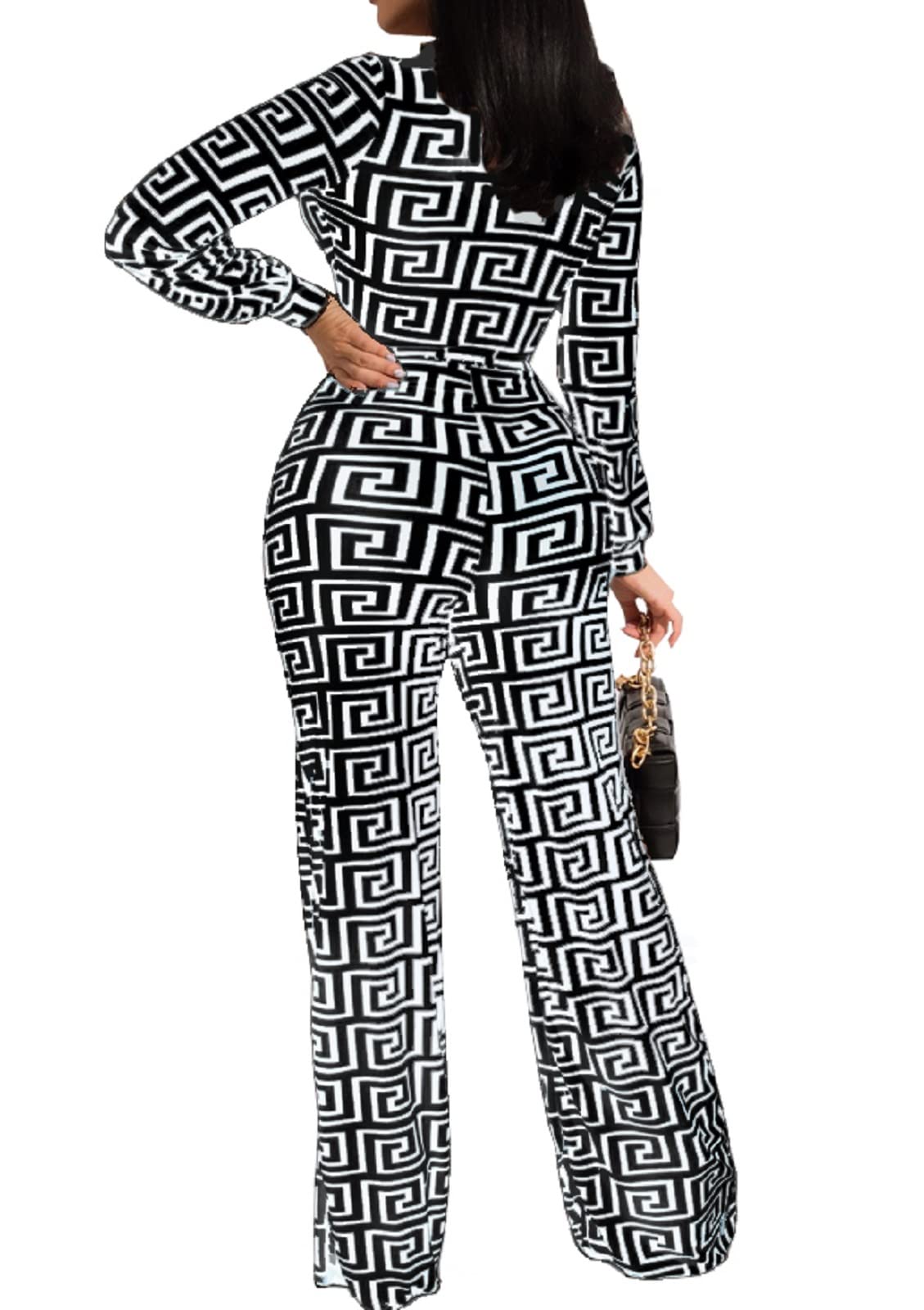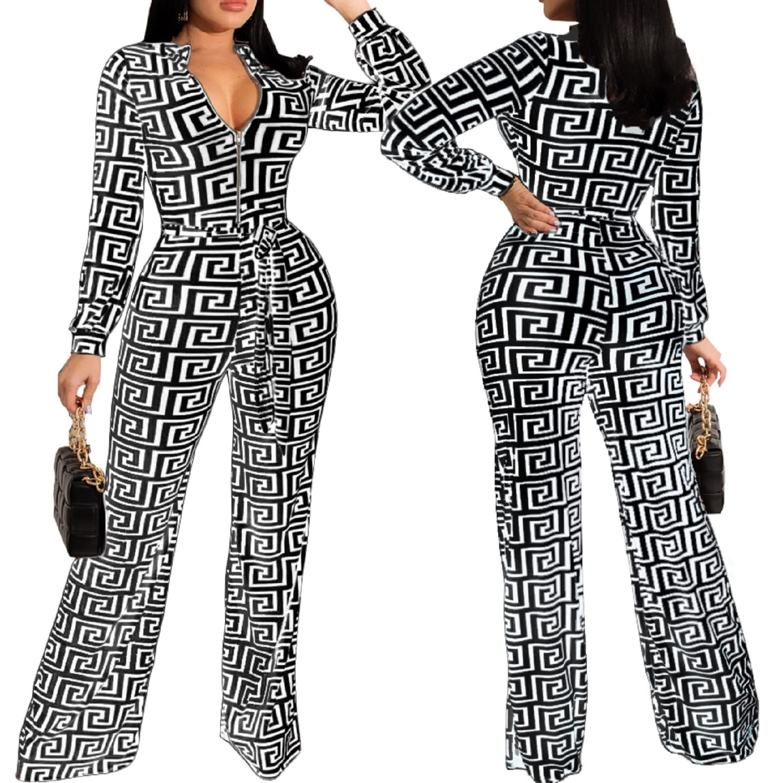• Feature:bandage,Chest zipper,long sleeve,wide leg long pants,irregular print would not 100% same as the pic,hidden zipper back