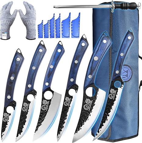 XYJ Professional Kitchen Knife Set with High-Carbon Steel Forged Blades, Chef's Knife, Cleaver, Carving Knife, Nakiri, Full Tang Design, Includes Carrying Bag & Poultry Scissors (9)