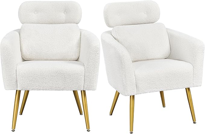 Yaheetech Accent Chair, Cozy Living Room Chair with Adjustable Headrest, Boucle Vanity Chair with Lumbar Pillow and Golden Legs, Modern Armchair for Bedroom Lounge Waiting Room Office, White, 2 Pieces