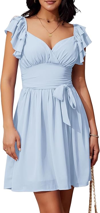 ZAFUL Women's Summer Ruffle Dress Tie Back Wedding Guest Dresses Short Sleeve Wrap V Neck Aline Casual Mini Dress