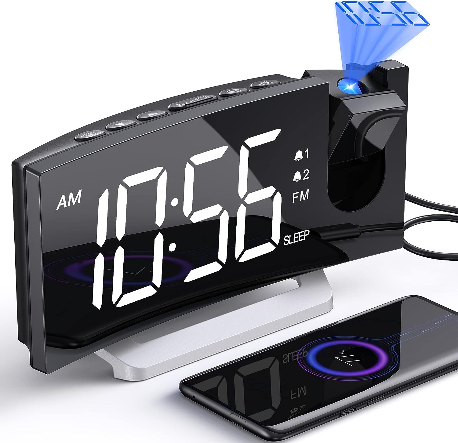 Alarm Clocks for Bedrooms, Multifunctional Clock with FM Radio & Projection, 0-100% Dimmer & Radio Volume, Curved Screen, Dual Alarms, USB Charger, Crystal LED Display,5 Alarm Sounds, Non-slip Base