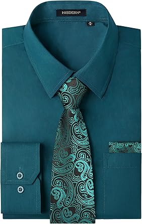 HISDERN Mens Dress Shirt and Tie Handkerchief Set Classic Long Sleeve Shirts Matching Ties Formal Button Down Shirts