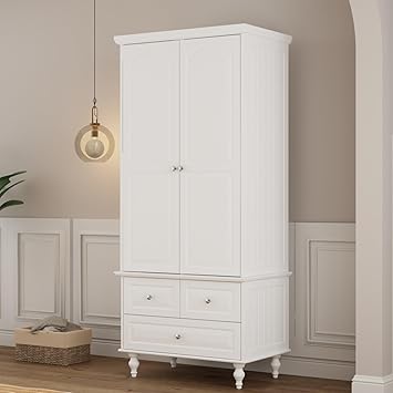 Hitow 2-Door Wardrobe Cabinet with Hanging Rod, Drawers and Shelves, Modern Free Standing Wood Storage Closet with Carved Lines and Sliver Knobs for Bedroom, White, 31.5Š—�W x 19.1Š—�D x 70.9Š—�H