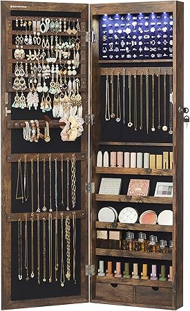SONGMICS 6 LEDs Mirror Jewelry Cabinet, 47.2-Inch Tall Lockable Wall or Door Mounted Jewelry Armoire Organizer, 2 Drawers, 3.9 x 14.6 x 47.2 Inches, Valentine's Day Gift, Rustic Brown UJJC93CB