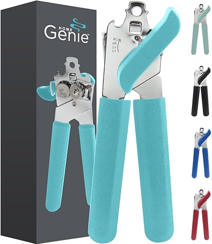 Home Genie Can Opener, Stainless Steel and Rust Resistant Blade, HandHeld Easy Turn Knob, Smooth Edge Cut on Lids, Large Handles with Bottle Top Openers, Kitchen Tool Accessories, Teal