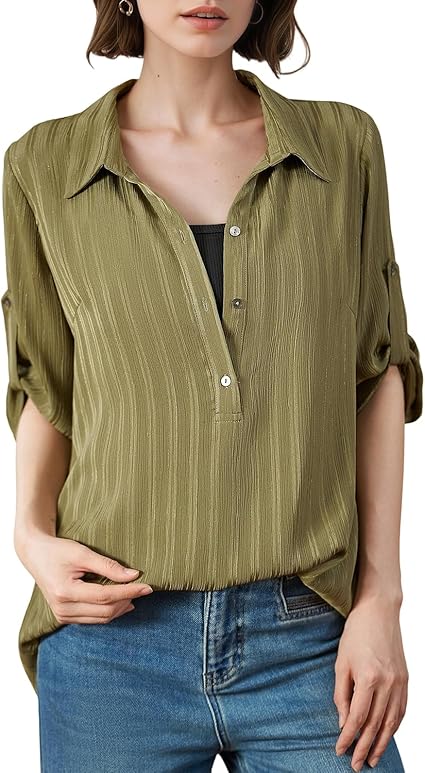 3/4 Sleeve Collared Shirts for Women Green Classic Business Casual Blouses Tops with Vertical Stripe Texture