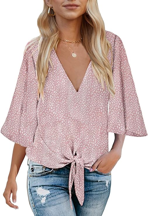 Bluetime Womens Summer Tops Boho 3/4 Sleeve V Neck Tie Front Shirts Casual Floral Blouses