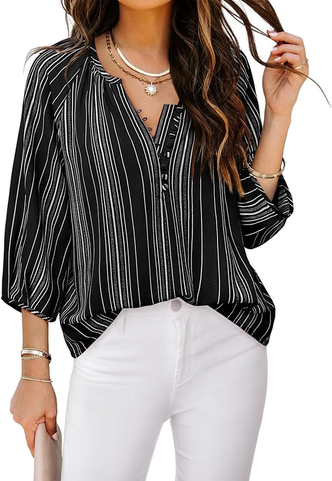 Womens Blouses Dressy Casual V Neck 3/4 Sleeve Tops Fashion Boho Chiffon Button Down Shirts