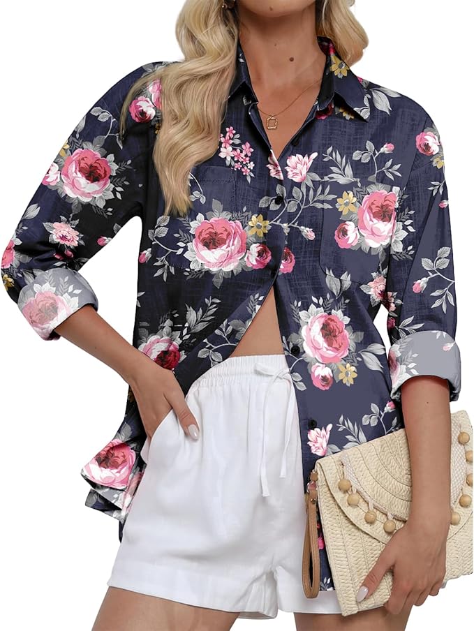 Womens Elegant Floral Print Long Sleeve Button Down Shirts with Pockets Casual Fashion Work Blouse Vacation Outfits
