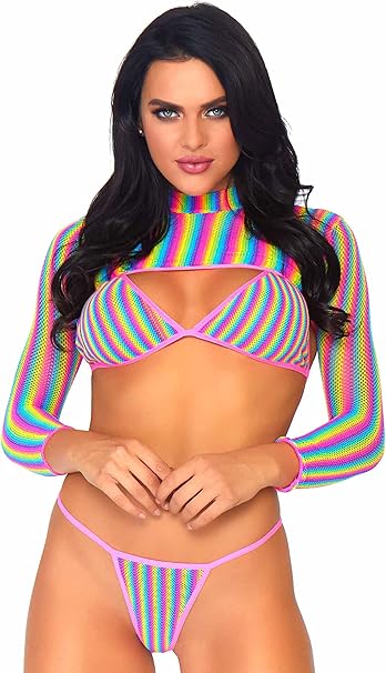 Leg Avenue womens 3 Pc Fishnet Bikini Top, G-string Panties, Long Sleeve Crop Top Set
