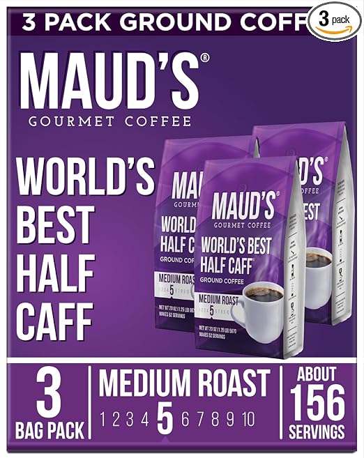 Maud's Half Caff Medium Roast Ground Coffee, 3 Bags, 20 Oz Each | World's Best Half Caff | 100% Arabica Medium Roast Coffee | Solar Energy Produced | 156 Servings