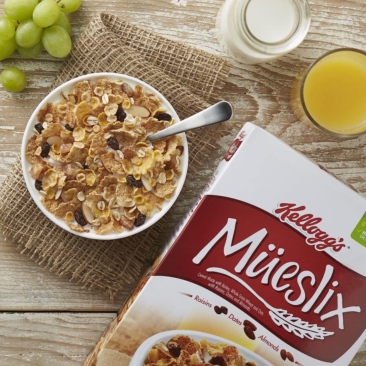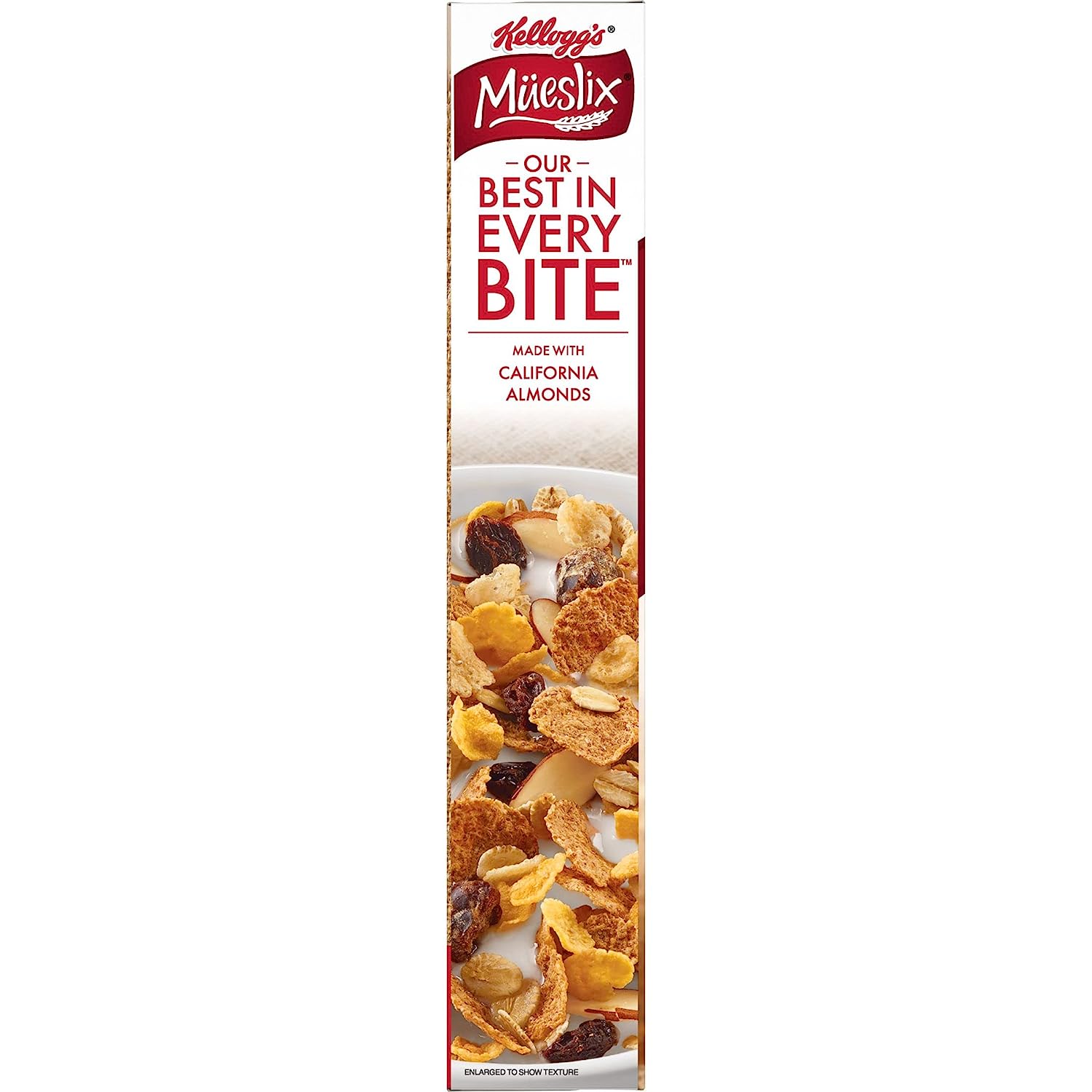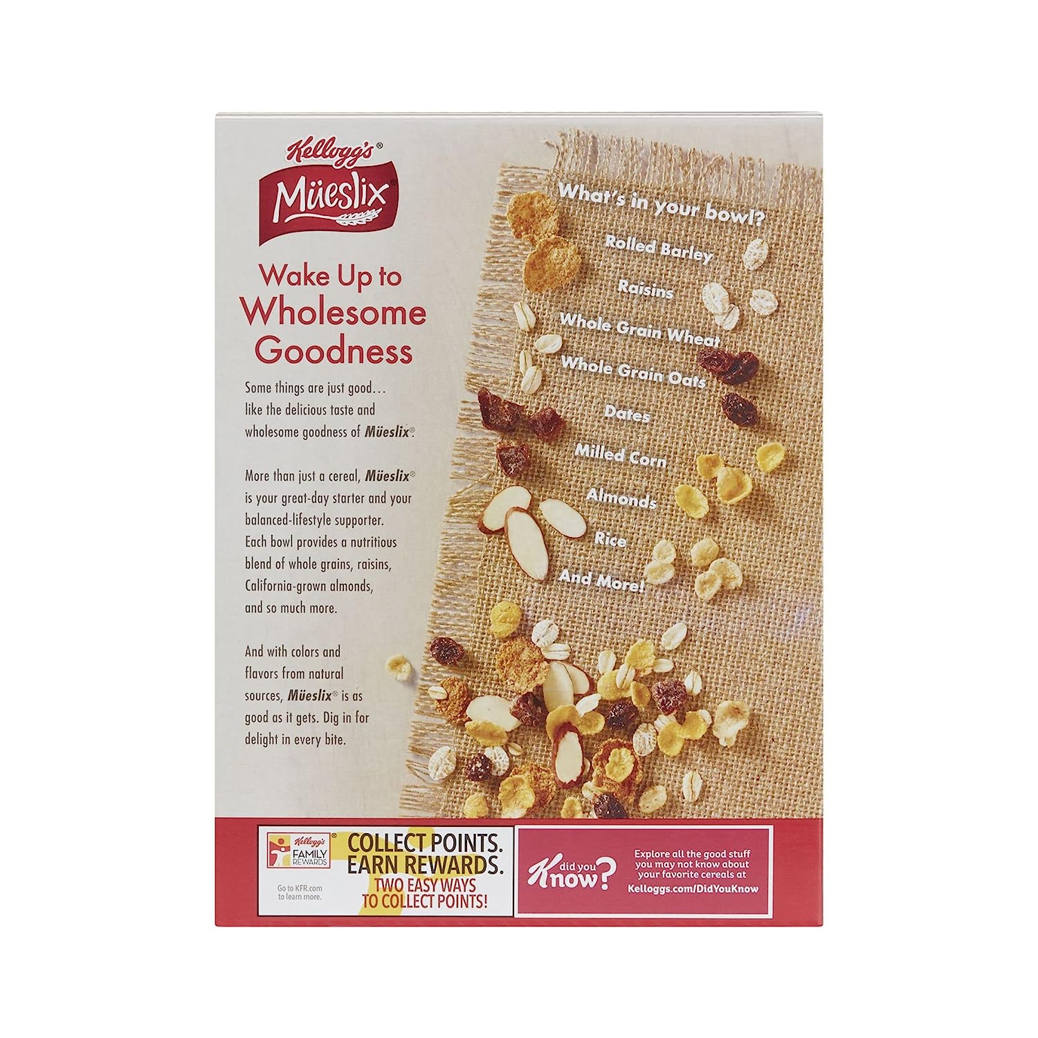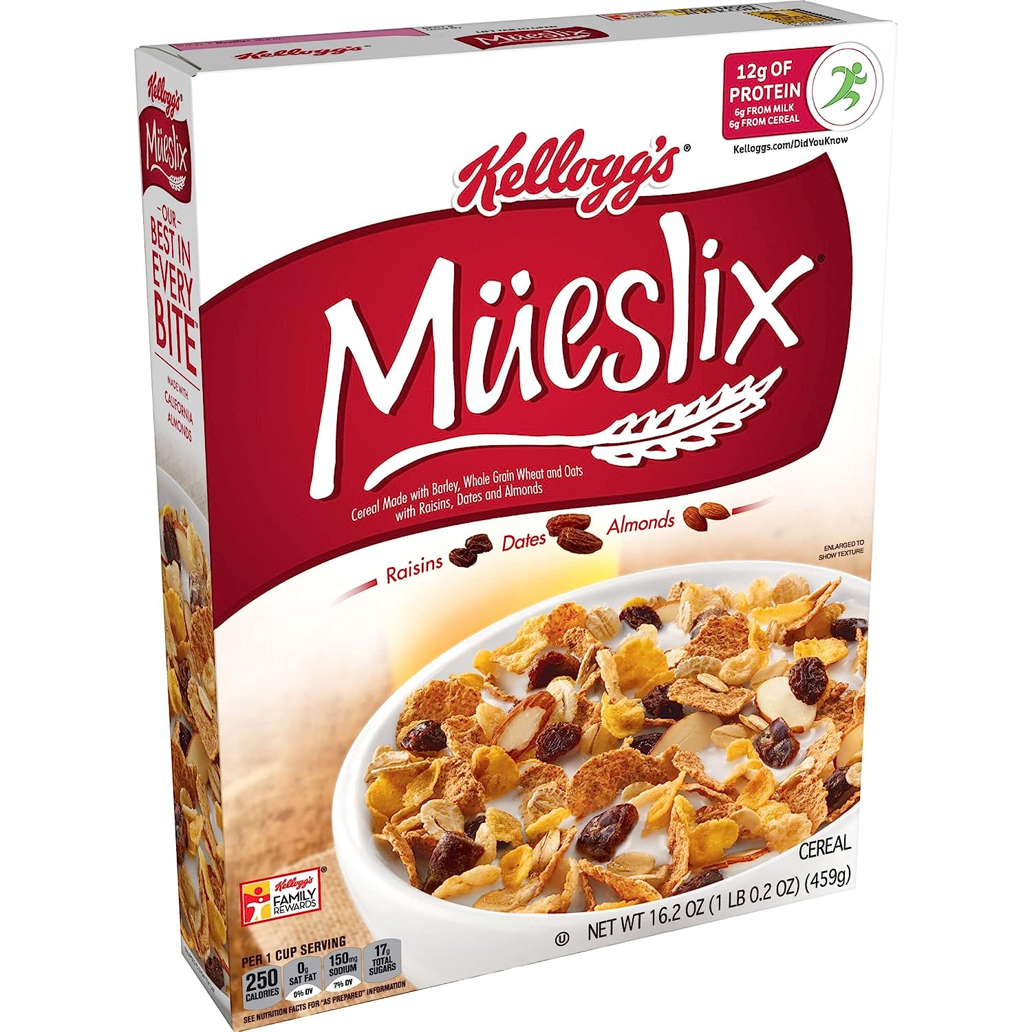 Start your day off right with Kellogg's Mueslix and enjoy this deliciously crafted cereal that helps you shine bright, even on your busiest days. Delightfully crunchy and flavorful, Kellogg's Mueslix is the perfect fit for your breakfast bowl. Kellogg's Mueslix is a good source of fiber (contains 3.5g total fat per serving), Kosher Pareve, and is made with whole grain and colors and flavors from natural sources; Made with a delectable combination of barley, whole-grain wheat, and oats with a tasty medley of raisins, dates, and almonds, Kellogg's Mueslix is here to help add energy to your mornings. Whether you enjoy a bowlful at breakfast time, add it to your yogurt for a snack at the office, or enjoy it straight from the box after your workout, Kellogg's Mueslix Cereal is good to the last irresistible bite. Kellogg's Mueslix is also a great base for trail mixes or addition to smoothie bowls or ice cream. The delicious options are endless.