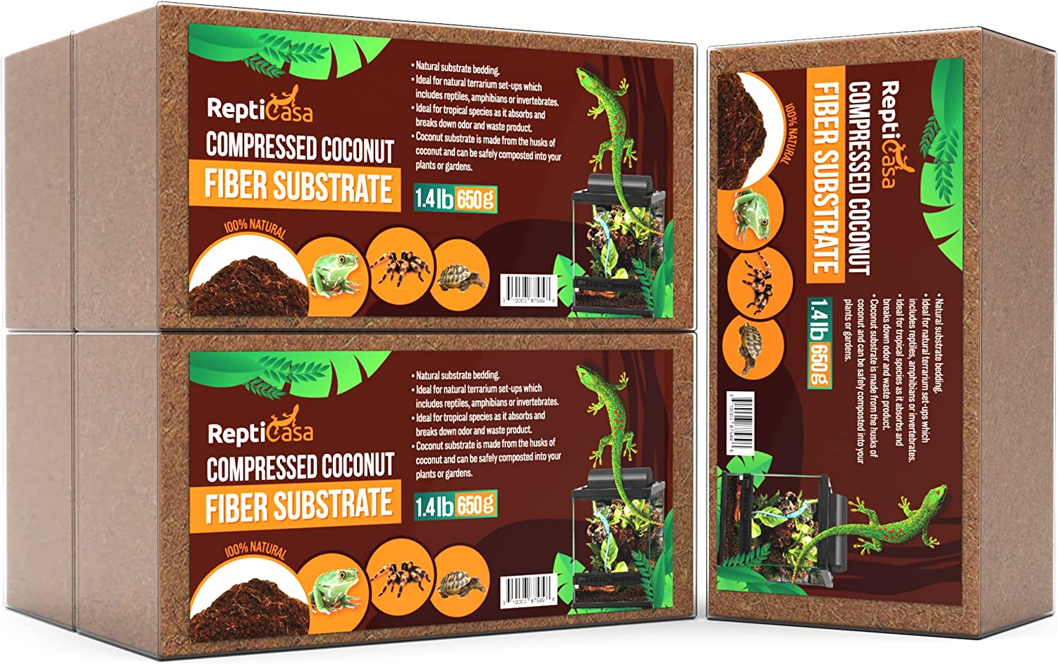 ReptiCasa Compressed Coconut Fiber Substrate, 1.4 lb. Bricks, Natural Husk Terrarium Bedding, Reptiles, Frogs, Snakes, or Tortoise, Odor and Waste Absorbent Compostable, 5 Pack