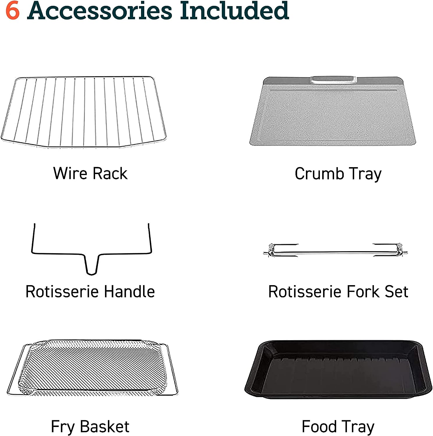 • RECIPES & ACCESSORIES: Check out the included 100 recipe book and 6 accessories such as the crumb tray, fry basket, food tray, wire rack, and rotisserie fork set for more cooking options. To purchase a toaster oven baking set, search “CAO1-3AC”