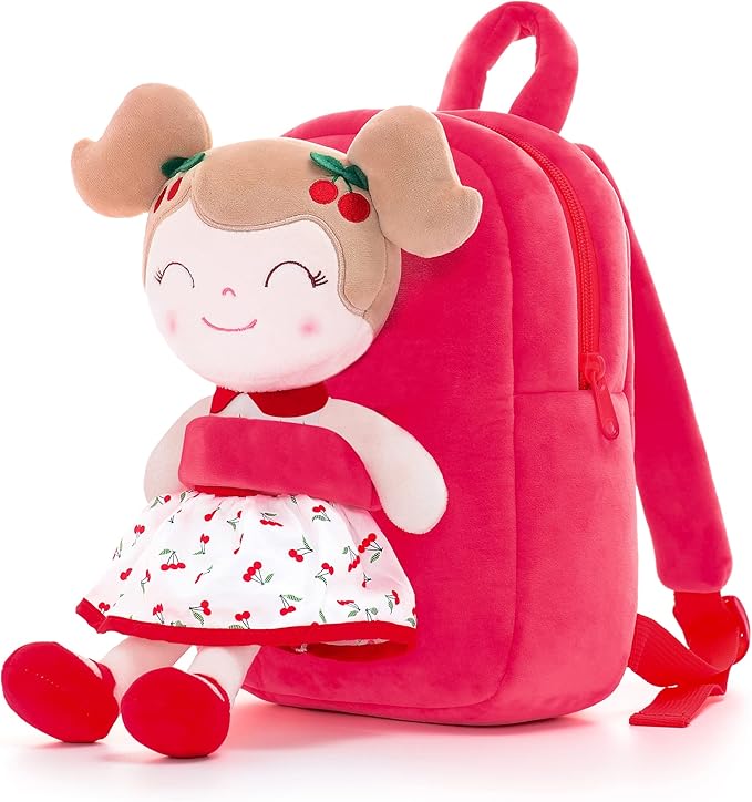 Gloveleya Toddler Backpack Plush Kids Bag with Soft doll Cherry Girl Red for Age 2+